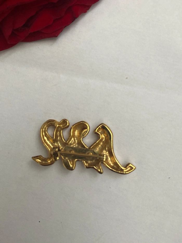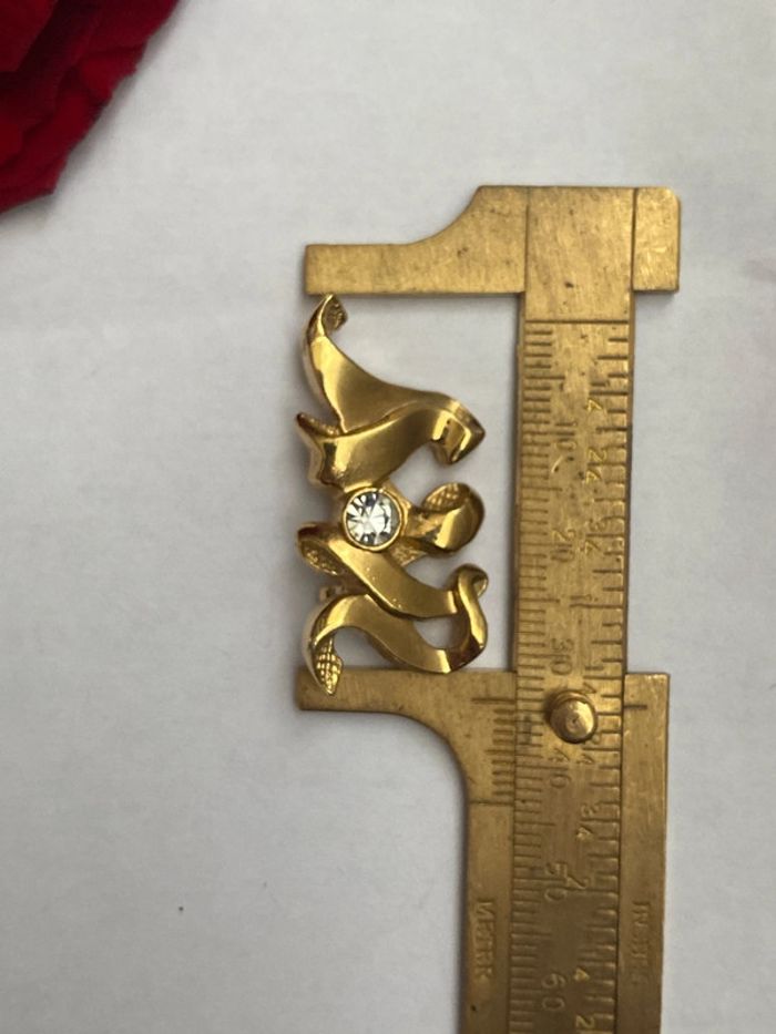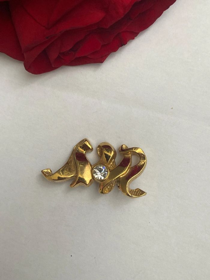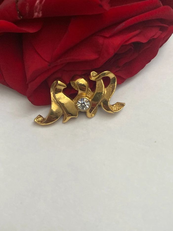Broche vintage en métal doré en forme de ruban ornée d’un strass cristal.