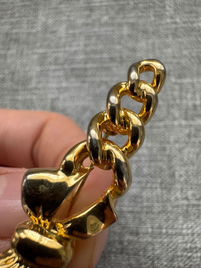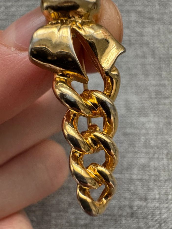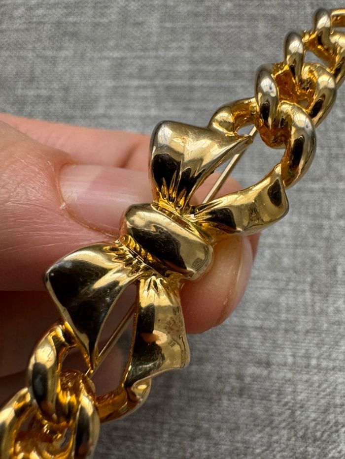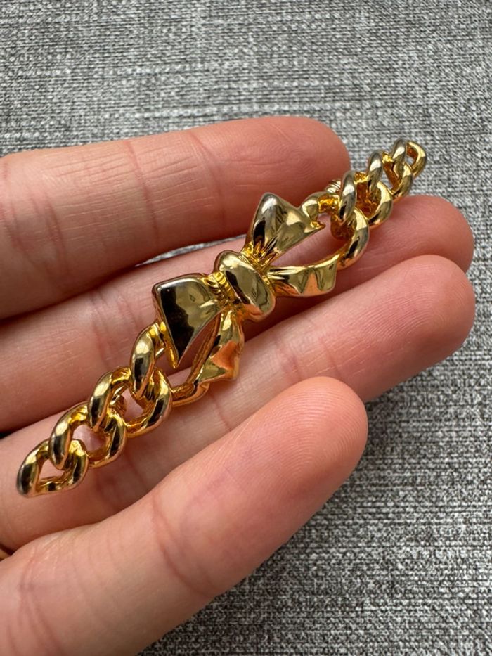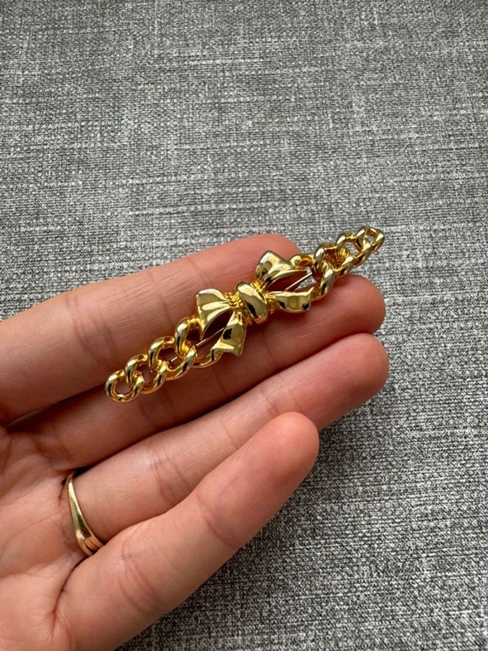 Broche élégante en métal doré, ornée d’un superbe nœud central et de maillons entrelacés, parfait pour ajouter une touche chic et intemporelle à vos tenues. Son design raffiné et sa finition brillante en font un accessoire idéal pour sublimer un manteau, une veste ou une robe. Un bijou classique et sophistiqué, prêt à compléter votre style avec élégance.