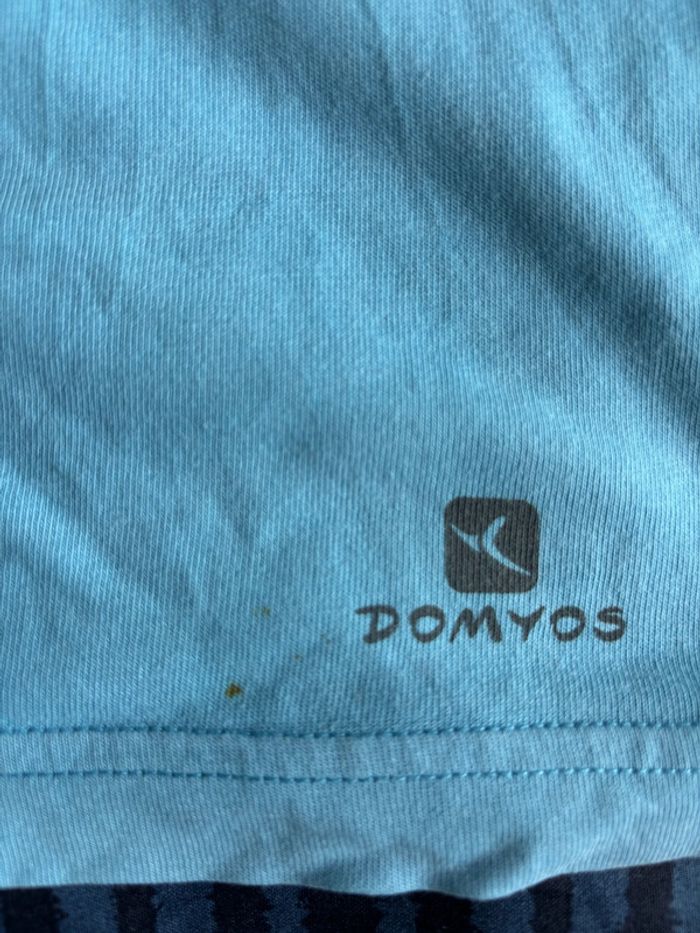 T-shirt bleu turquoise Domyos. Une petite tache sur le bas du tshirt (voir photo 4)