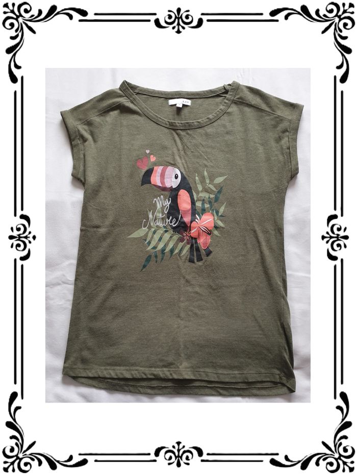 Tee shirt taille 36. Tee shirt manches courtes kaki motif toucan. 60 % coton, 40 % polyester. Largeur sous les bras : 42,5 cm Largeur à la taille : 40 cm Longueur : 58,5 cm En très bon état. La Halle. 3,00€. #vero38110vetementsfemme36