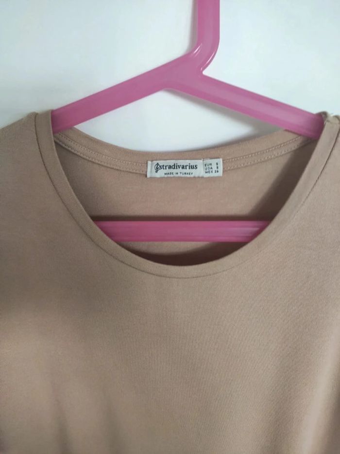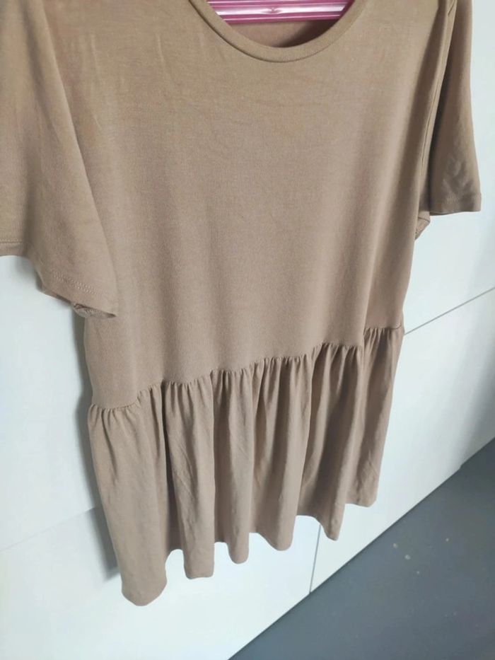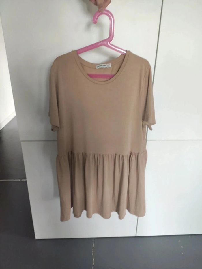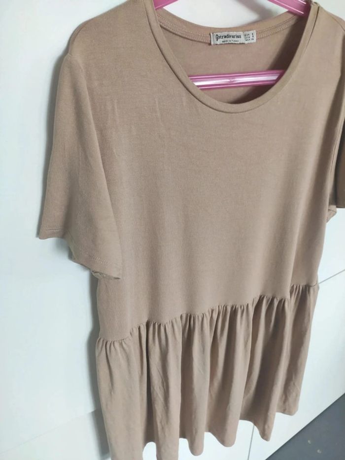 Vêtement Stradivarius qui peut servir de robe courte, de tunique ou t shirt péplum un peu long. Plus large vers le bas. Très bon état. Taille S, acheté dans un magasin Stradivarius Hauteur total 70 cm. Couleur beige camel. En viscose avec de l'élasthanne, extensible et matière qui donne un joli tombé #vulariFemmesS36