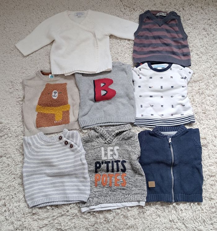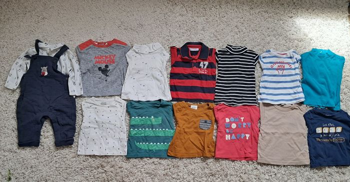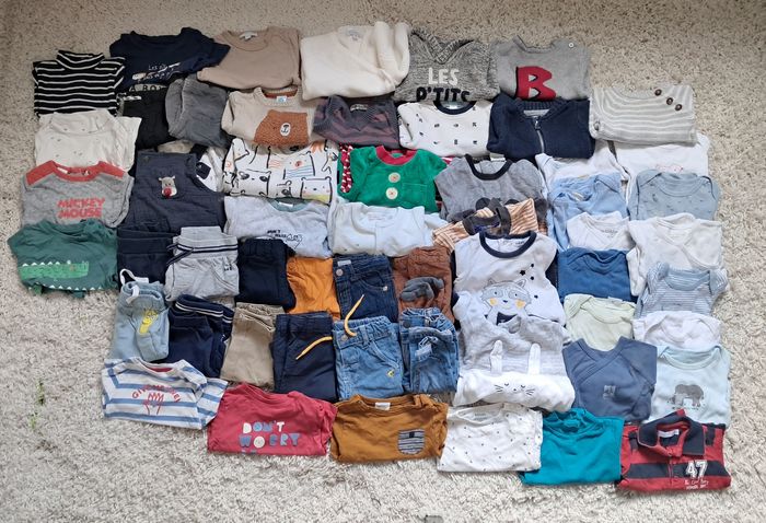 Lots de vêtements de très bon état en bon état Il y'a des pulls, gilets, T-shirts ML, sous pull, bodies ml, pyjamas, pantalons, joggings.... 55 pieces Nb: il peut y avoir des petites tâches