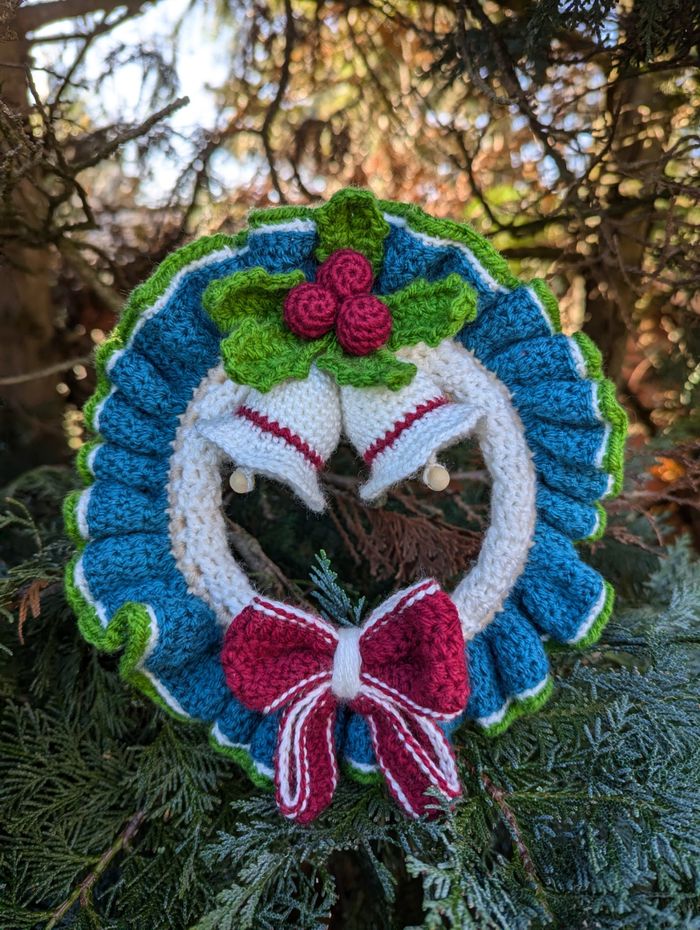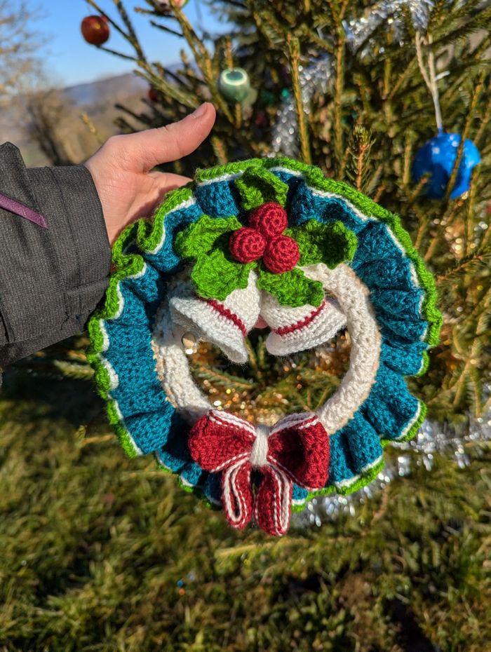 Une petite couronne d'hiver au crochet fait par mes soins : • Laine 100% acrylique • Ouate 100% polyester • Cerceau en bambou • Perles en bois • Diamètre environ 20cm