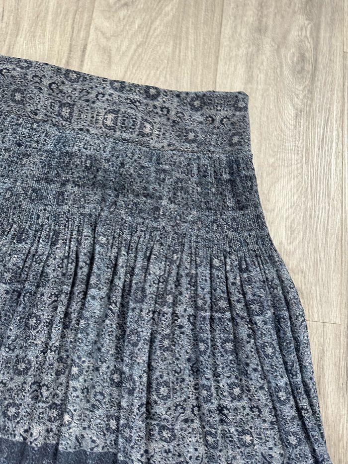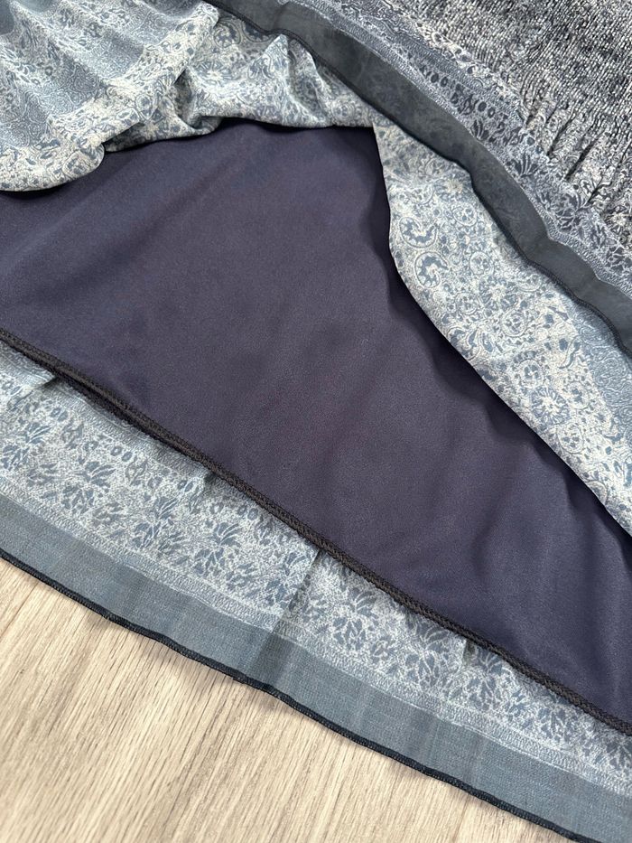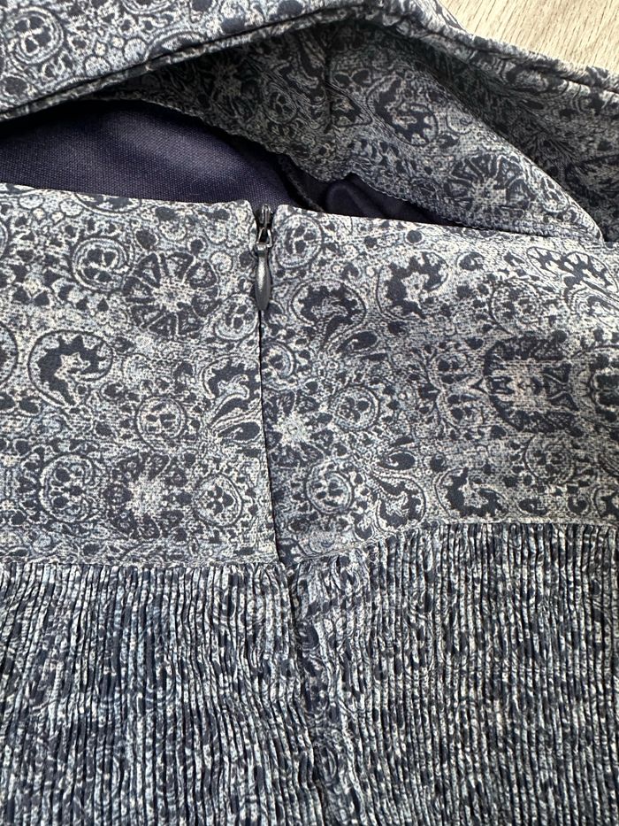 Jupe - Excellent état - Taille 40/42 équivalent L/XL Dimensions en bas de l’annonce - Marque Armand Thiery - Bleue marine et blanche - Imprimés mosaïques - Doublure intérieure - Élastique à la taille - Zip sur le côté Dimensions: - 40 à 42cm à la taille - 60cm de long