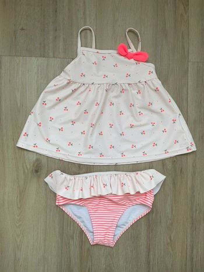 Maillot de bain 2 pièces Kiabi rose avec motifs cerises, en très bon état, peu porté, taille 18 mois