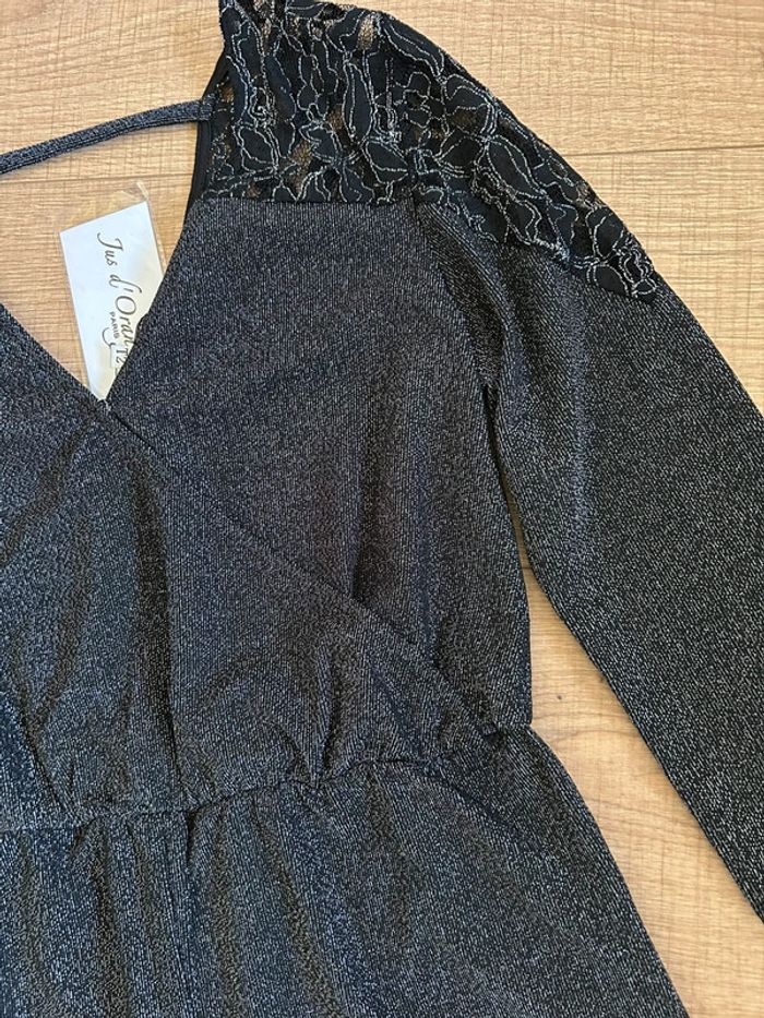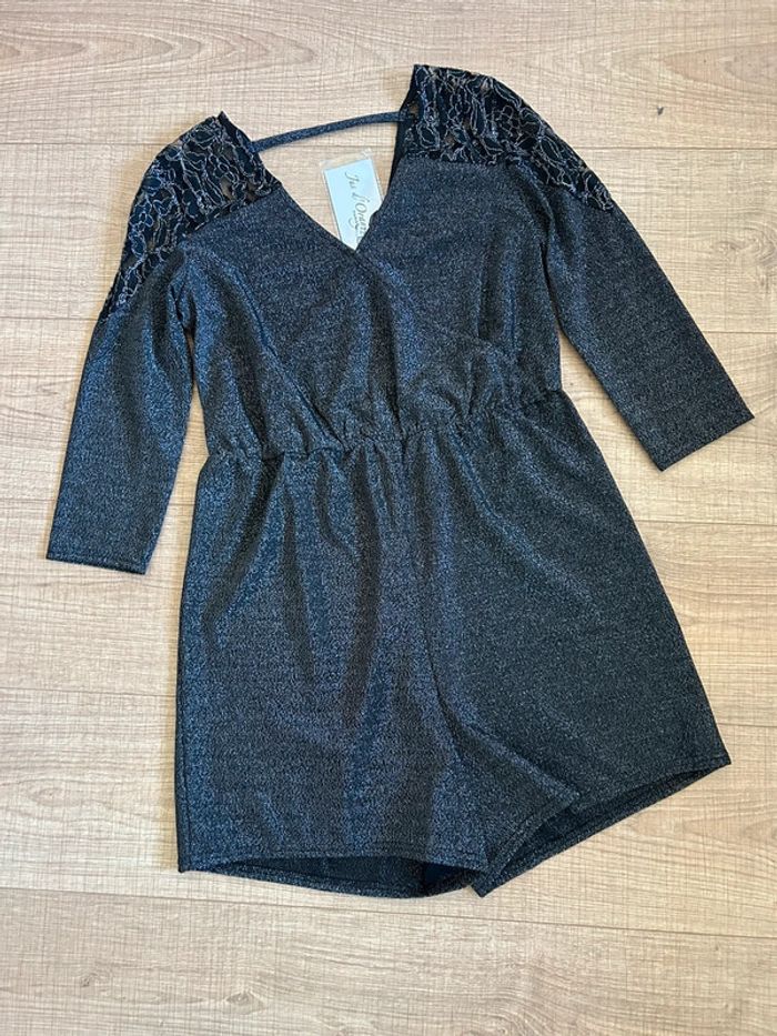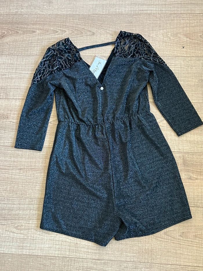 Magnifique Combishort argenté pailleté avec dentelle, de marque Jus d’Orange. Taille 2 qui correspond à du 38. Il est neuf avec étiquette. aisselle à aisselle 45 cms et plus épaule à épaule 36 cms et plus taille 37 cms et plus longueur depuis épaule 78 cms Le tissu est extensible 100% polyester Le prix reste négociable dans la limite du raisonnable. Un petit cadeau dans le colis 🌸