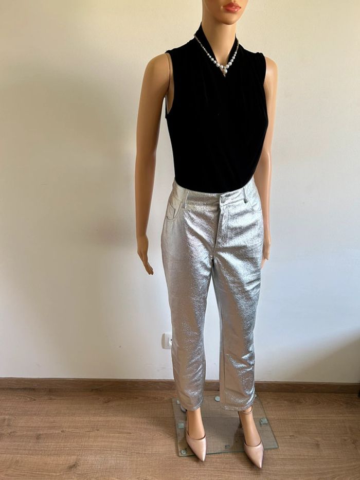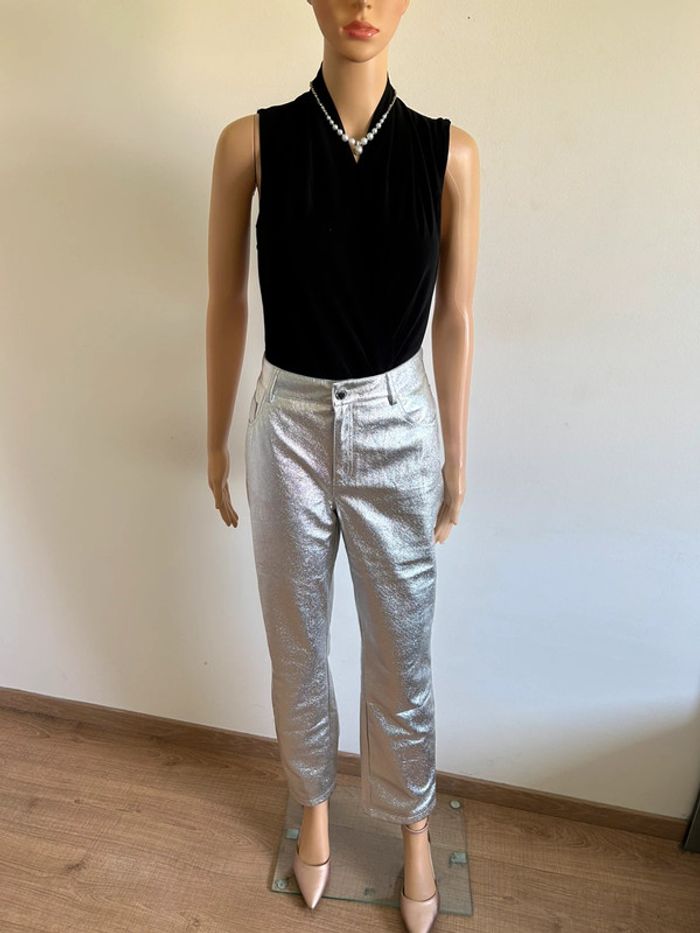 Magnifique pantalon argenté de marque Morgan. Taille 40. Il est neuf avec étiquette (valeur 65€). taille 40 cms longueur 102 cms longueur entrejambes 74 cms 100% polyester Le prix reste négociable dans la limite du raisonnable. Un petit cadeau dans le colis 🌸