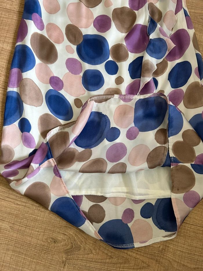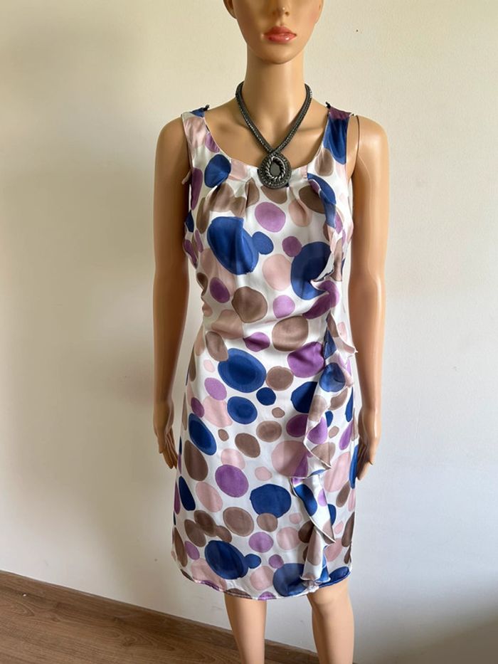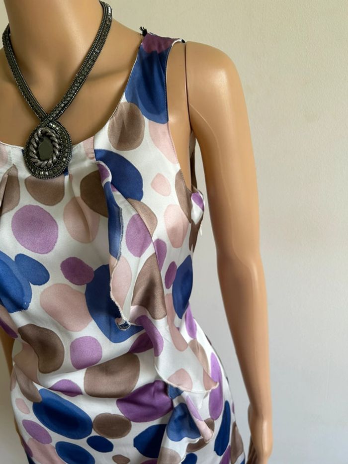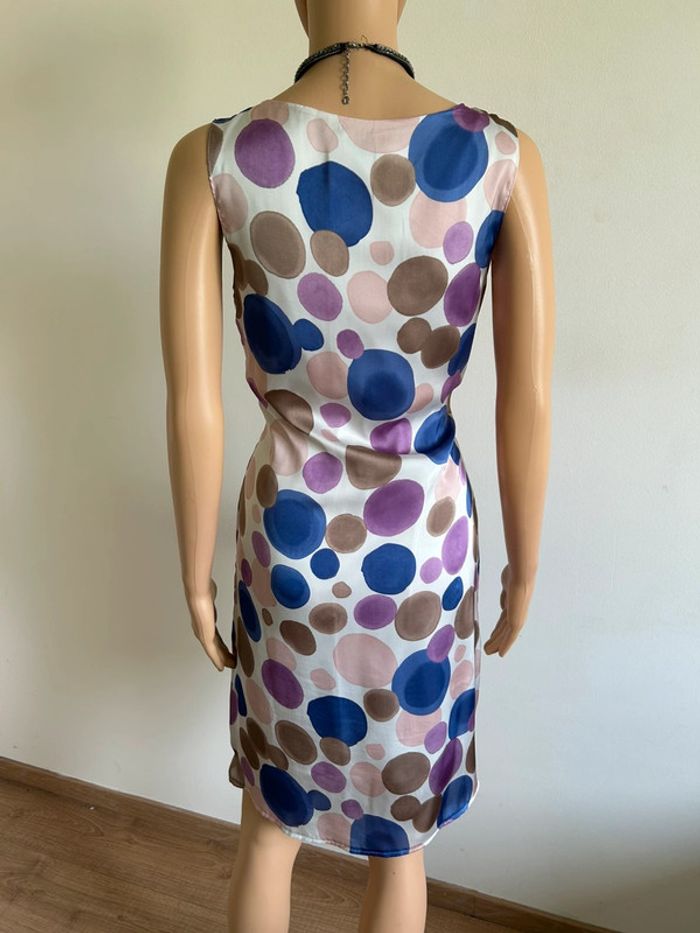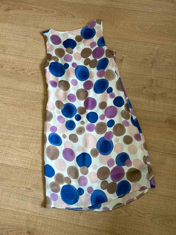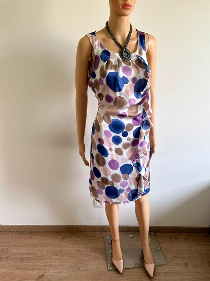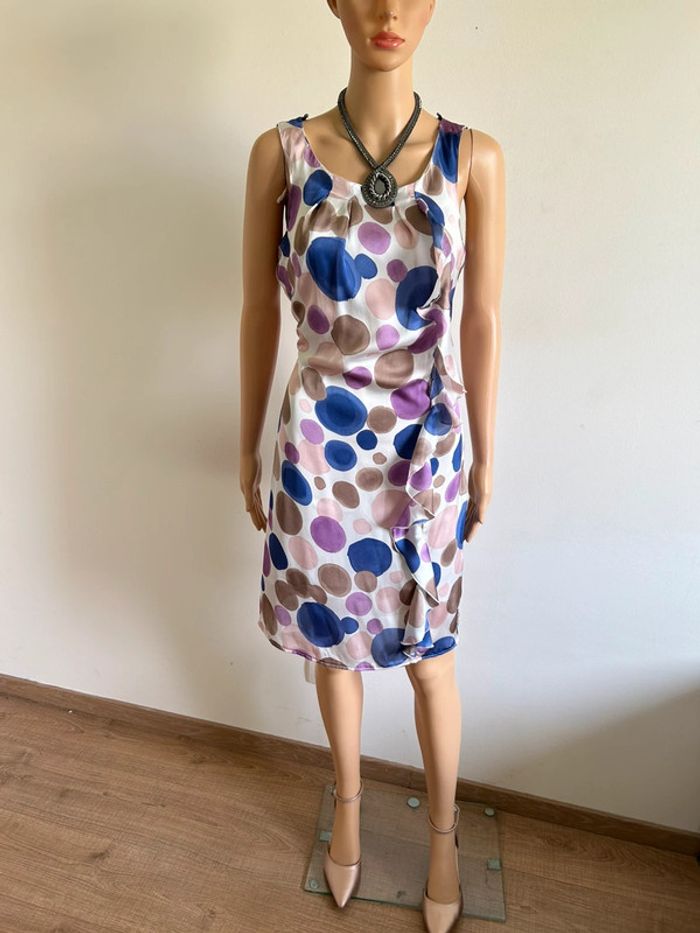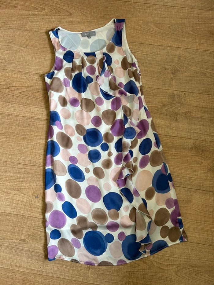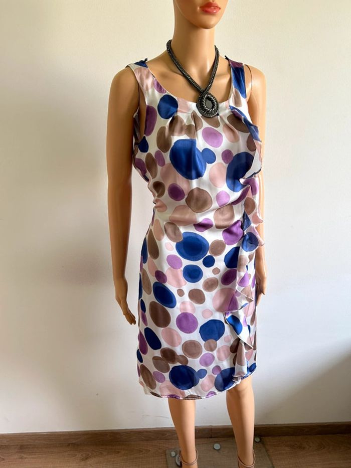 Jolie robe satinée blanche et imprimée, sans manches, de marque JBC. Fermeture sur le côté. Taille 38. Peu portée, en très bon état. aisselle à aisselle 46 cms taille 41 cms longueur depuis épaule 95 cms 100% polyester Le prix reste négociable dans la limite du raisonnable. Un petit cadeau dans le colis 🌸