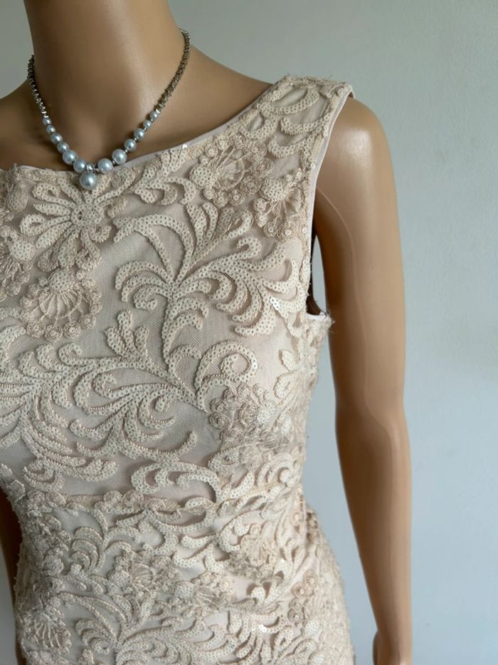 Jolie robe beige sans manches, avec sequins, de marque Naf Naf. Fermeture dans le dos. Taille 36. Portée plusieurs fois, en bon état. aisselle à aisselle 44 cms taille 37 cms longueur depuis épaule 84 cms 80% polyester et 20% polyamide