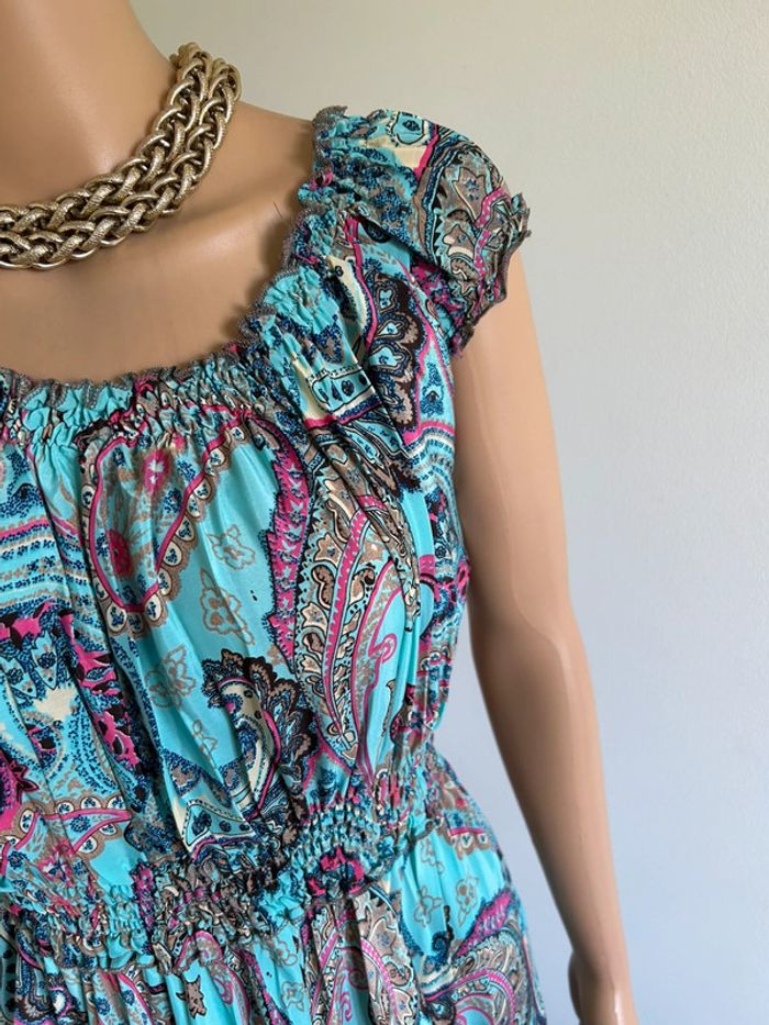 Magnifique robe longue turquoise et imprimée en soie, à manches courtes, de marque Trebol. Taille unique qui convient jusqu’au 40. Elle est neuve avec étiquette. aisselle à aisselle 34 cms à 60 cms taille 25 cms à 52 cms longueur depuis épaule 105 cms à 121 cms La taille est extensible 70% soie et 30% polyester Le prix reste négociable dans la limite du raisonnable. Un petit cadeau dans le colis 🌸