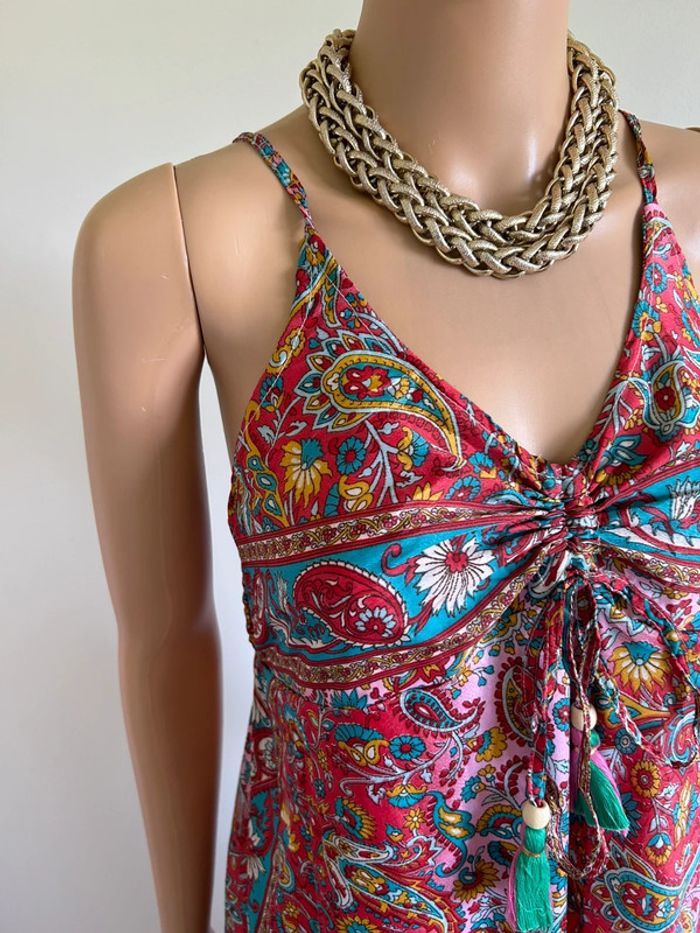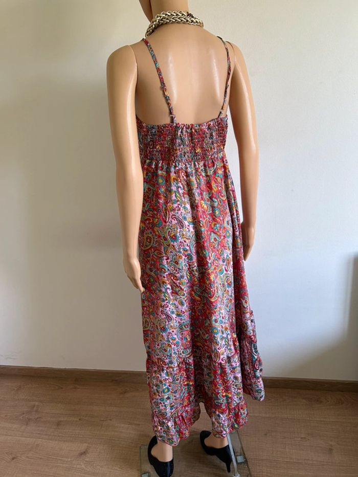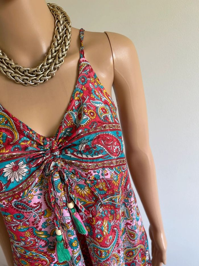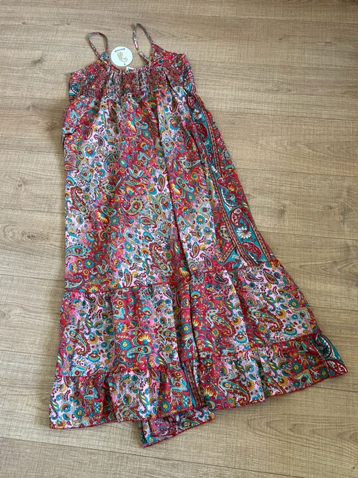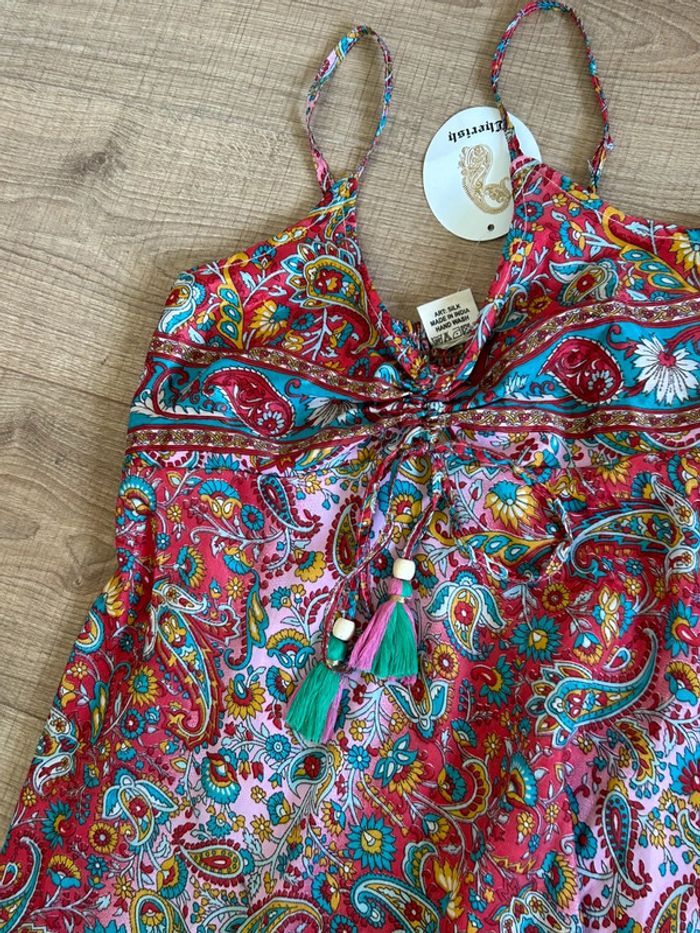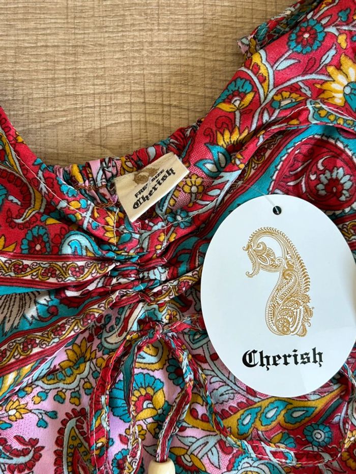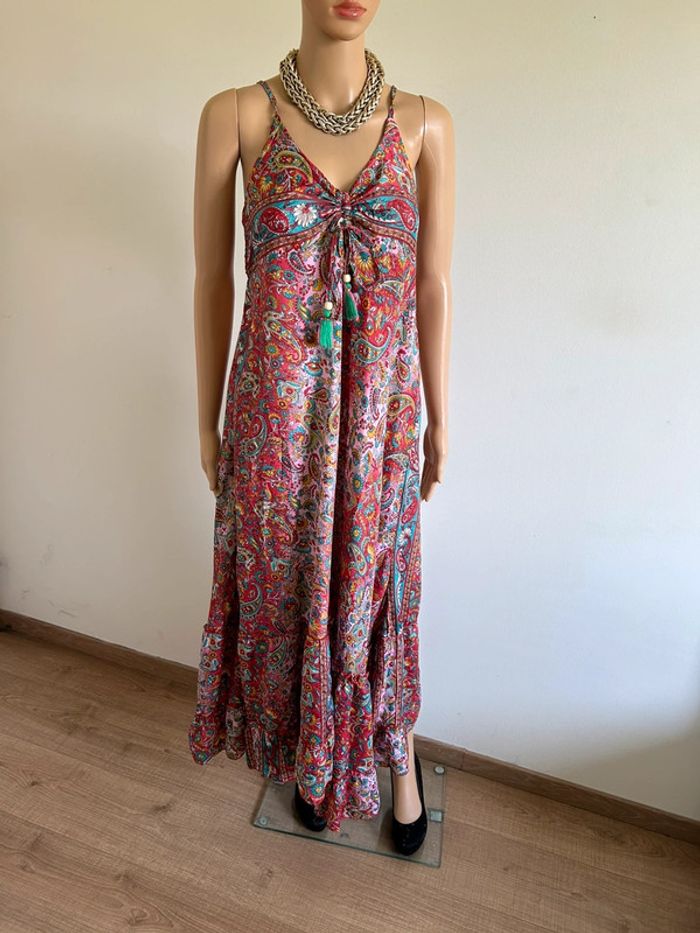 Jolie robe longue en soie à bretelles, de marque Cherish. Taille unique qui convient jusqu’au petit 40. Elle est neuve avec étiquette. aisselle à aisselle 38 cms à 46 cms taille 41 cms à 45 cms longueur depuis épaule environ 125 cms La taille est extensible 100% soie Le prix reste négociable dans la limite du raisonnable. Un petit cadeau dans le colis 🌸