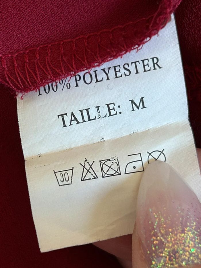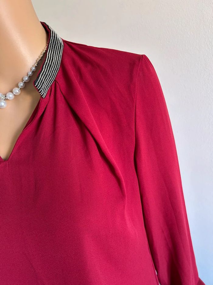 Blouse rouge bordeaux à manches longues, de marque Boh Love. Strass au niveau du col. Taille M. Jamais portée, état neuf. aisselle à aisselle 53 cms épaule à épaule 40 cms longueur manches 58 cms taille 50 cms longueur depuis épaule 62 cms 100% polyester Le prix reste négociable dans la limite du raisonnable. Un petit cadeau dans le colis 🌸 (Boîte 4)