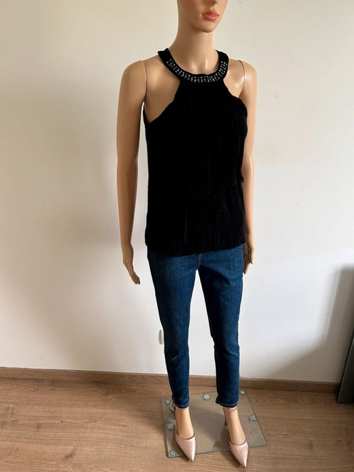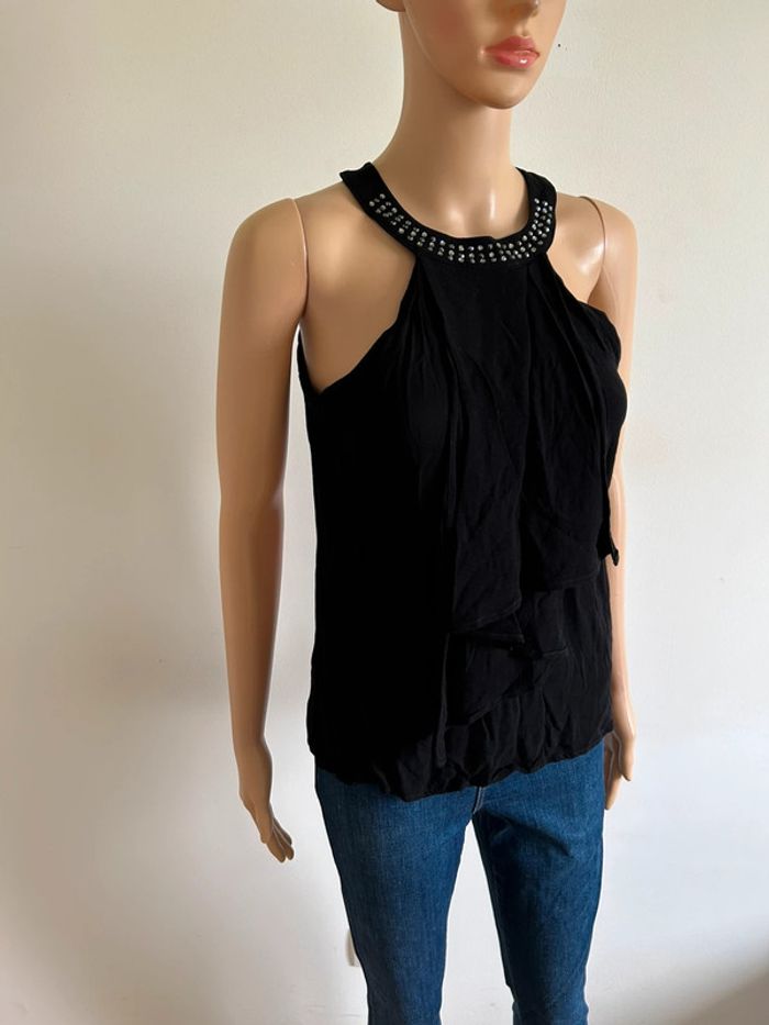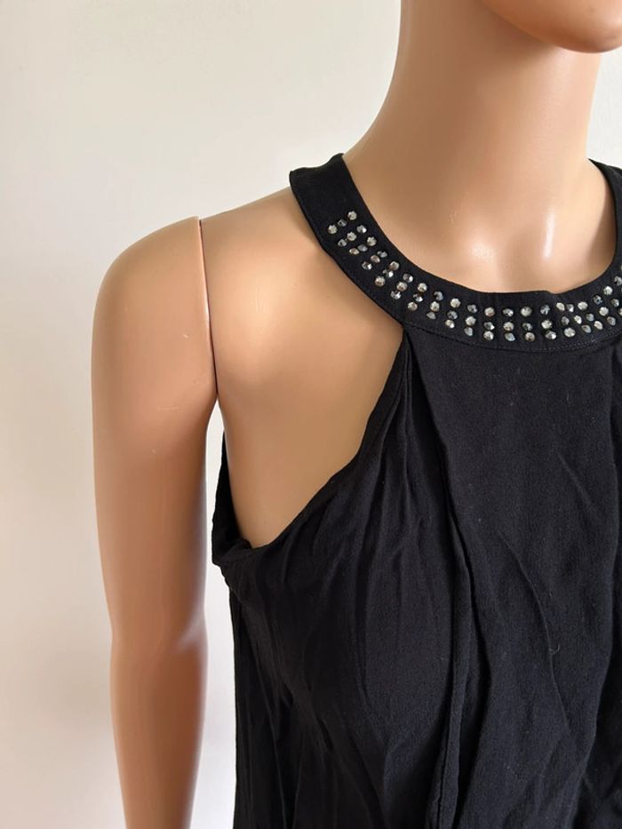 Jolie blouse noire sans manches, avec strass argentés, de marque Morgan. Taille 38. Jamais portée, état neuf. aisselle à aisselle 43 cms taille 40 cms longueur depuis aisselle 41 cms 100% viscose Le prix reste négociable dans la limite du raisonnable. Un petit cadeau dans le colis 🌸 (Boîte 51)