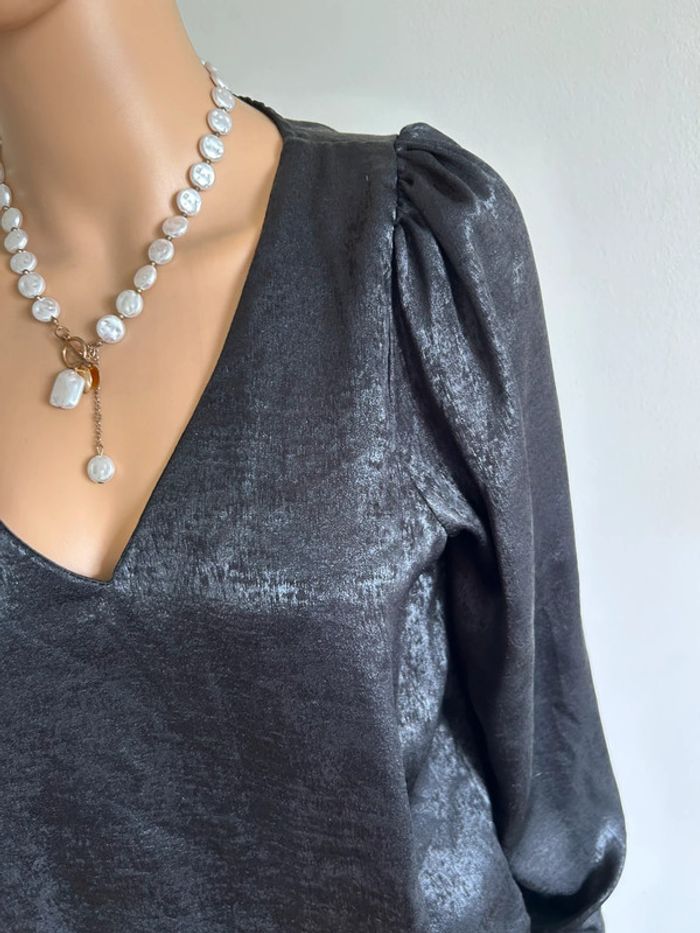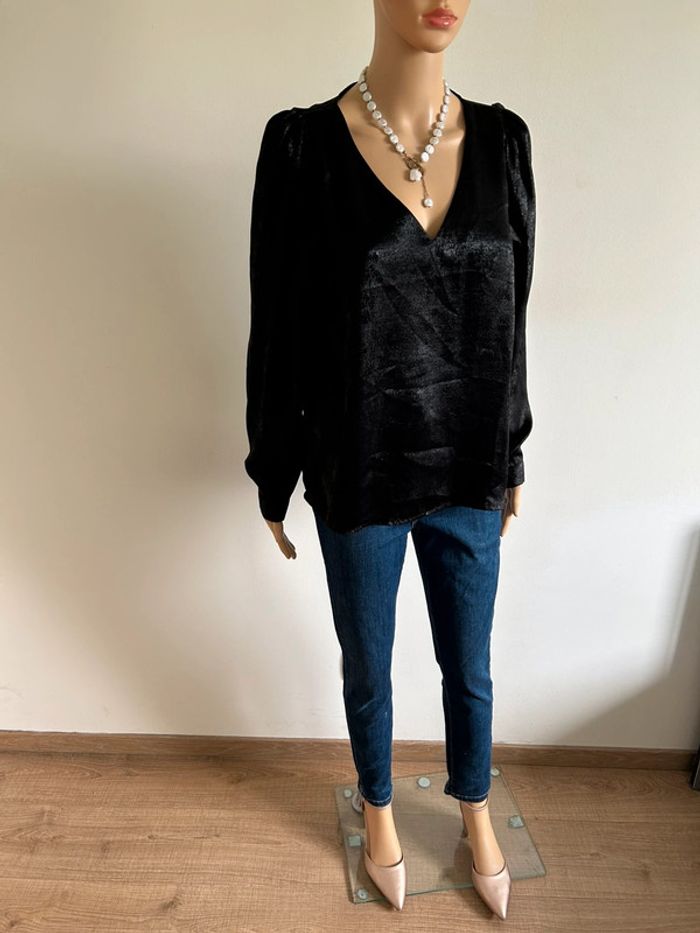 Magnifique blouse noire irisée à manches longues, de marque Emma Ella. Taille S. Jamais portée, état neuf. aisselle à aisselle 48 cms épaule à épaule 38 cms longueur manches 62 cms taille 48 cms longueur depuis épaule 61 cms 100% polyester Le prix reste négociable dans la limite du raisonnable. Un petit cadeau dans le colis 🌸 (Boîte 51)