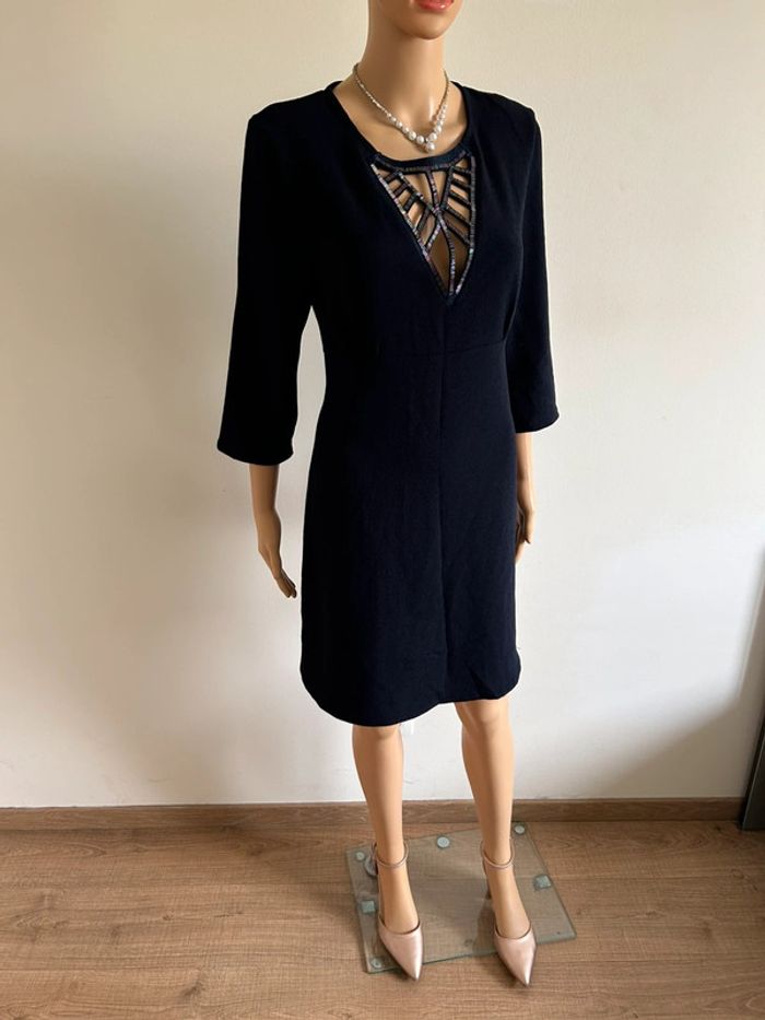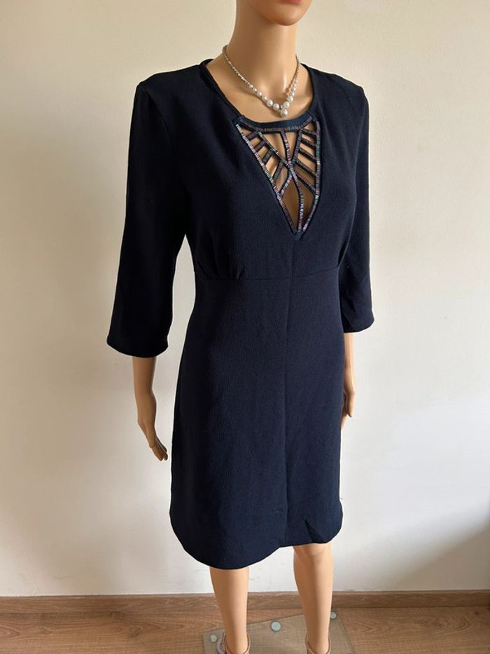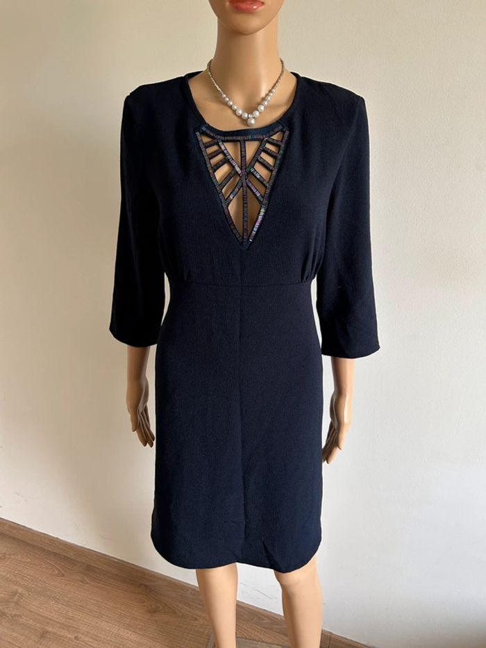 Jolie robe bleue marine avec manches 3/4, de marque Morgan. Taille 40. Jamais portée, état neuf. aisselle à aisselle 49 cms et plus épaule à épaule 40 cms et plus longueur manches 45 cms taille 45 cms et plus longueur depuis épaule 89 cms Le tissu est extensible 95% polyester et 5% elasthanne Le prix reste négociable dans la limite du raisonnable. Un petit cadeau dans le colis 🌸