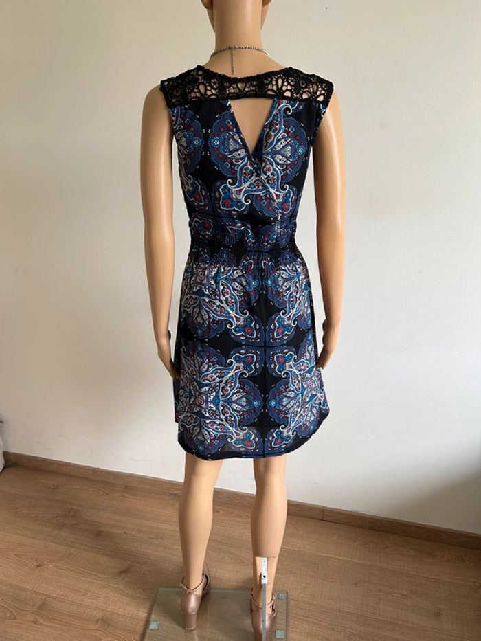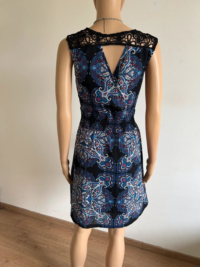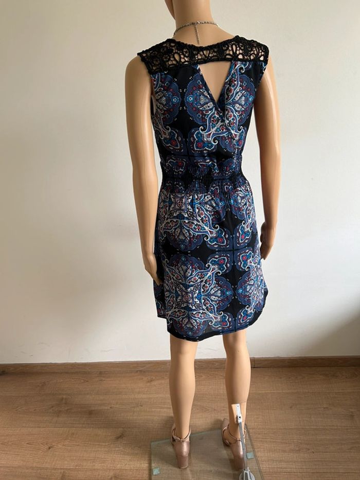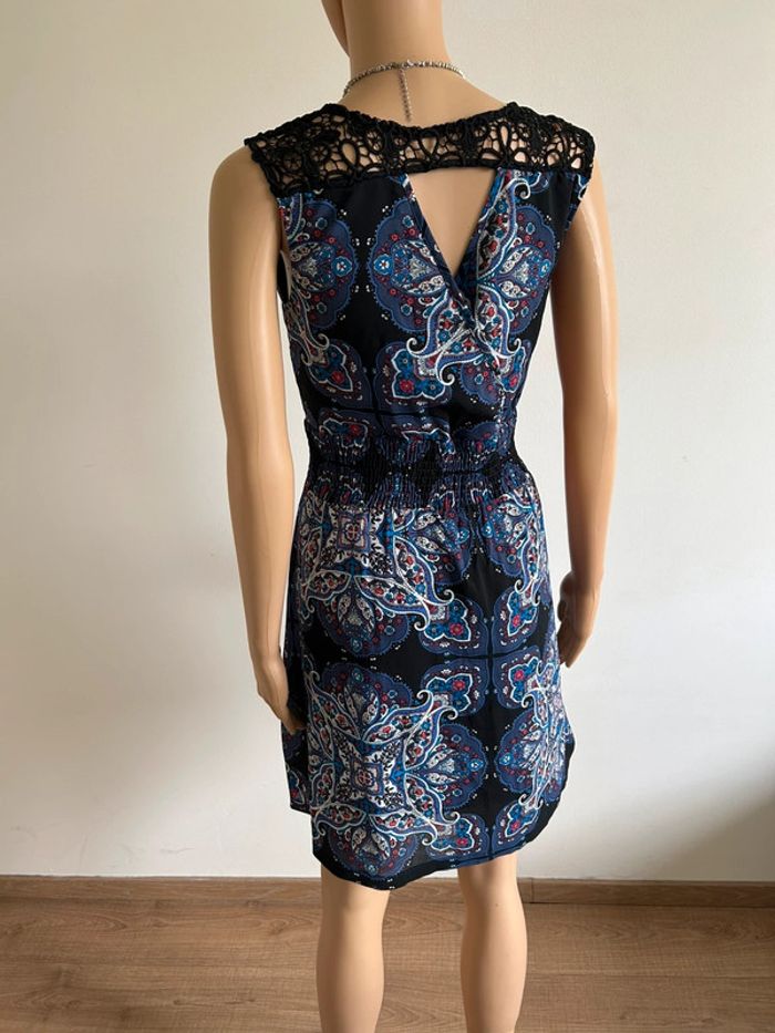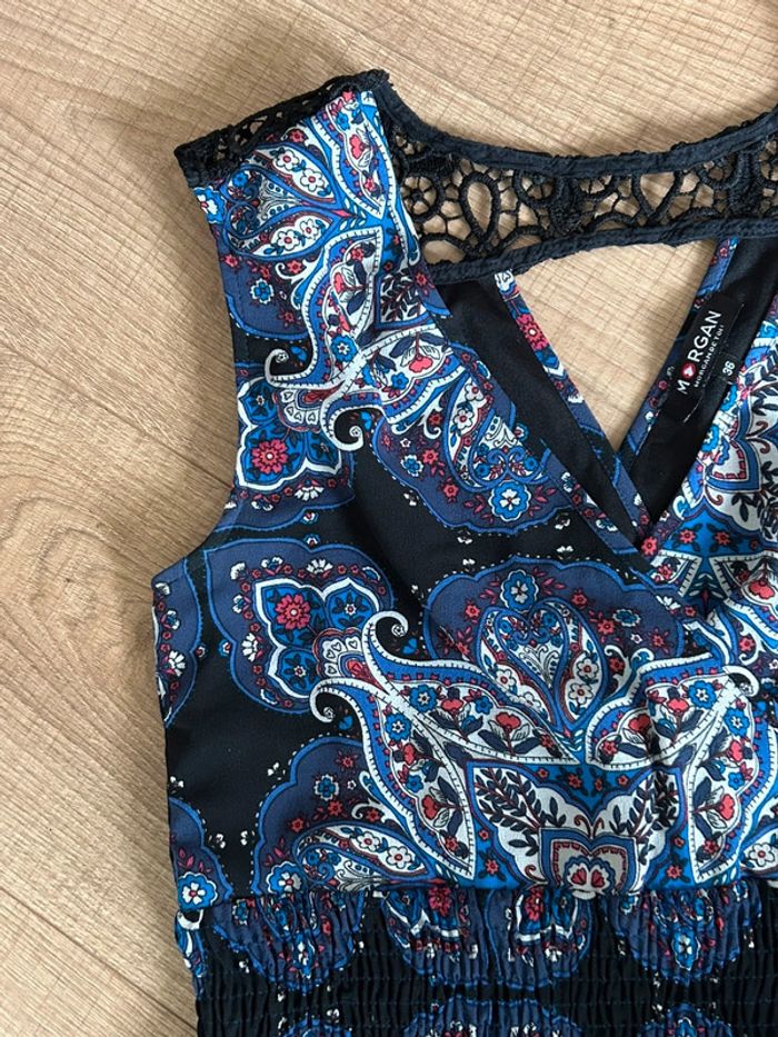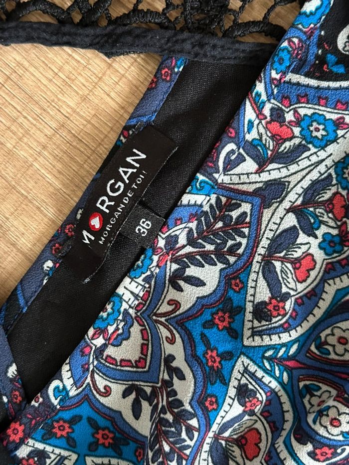 Jolie robe imprimée sans manches, avec dentelle, de marque Morgan. Taille 36. Jamais portée, état neuf. aisselle à aisselle 43 cms taille 37 cms et plus longueur depuis épaule 89 cms La taille est extensible 100% polyester Le prix reste négociable dans la limite du raisonnable. Un petit cadeau dans le colis 🌸 (Boîte 32)