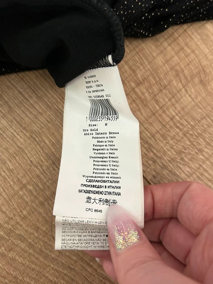 Jolie robe noire et dorée pailletée, sans manches, de m’arque Rinascimento. Taille M. Portée souvent, en bon état. aisselle à aisselle 50 cms et plus taille 37 cms et plus longueur depuis épaule 82 cms Le tissu est extensible 94% acetane et 6% elasthanne Le prix reste négociable dans la limite du raisonnable. Un petit cadeau dans le colis 🌸
