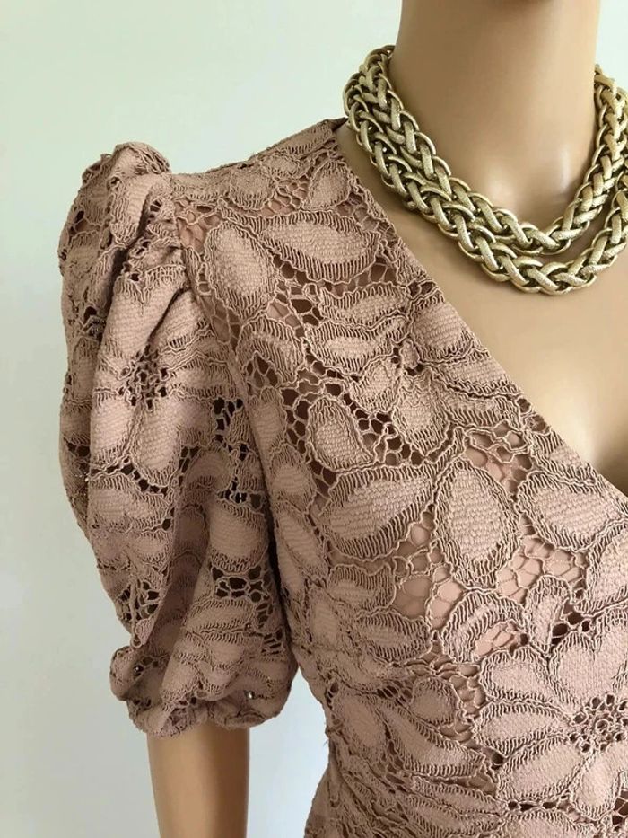 Jolie robe rose beige en dentelle, à manches courtes, de marque Mango. Fermeture dans le dos. Taille S. Très peu portée, elle est comme neuve. aisselle à aisselle 45 cms épaule à épaule 36 cms taille 36 cms longueur depuis épaule 87 cms Étiquette intérieure de composition coupée Le prix reste négociable dans la limite du raisonnable. Un petit cadeau dans le colis 🌸 (Boîte 33)