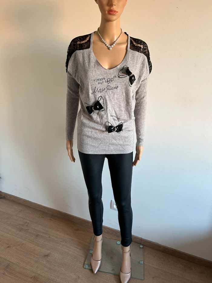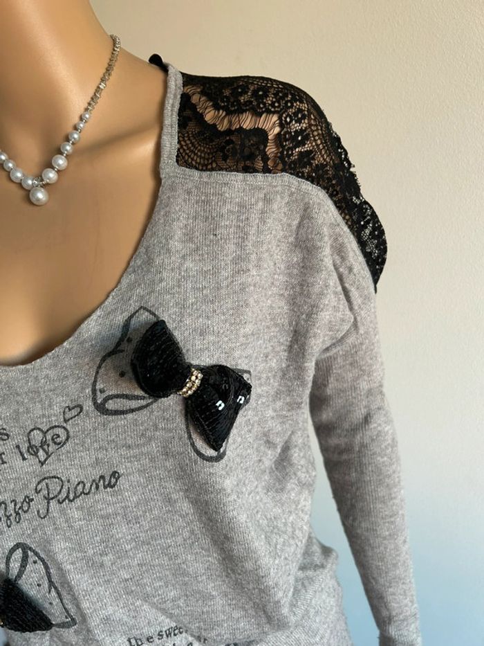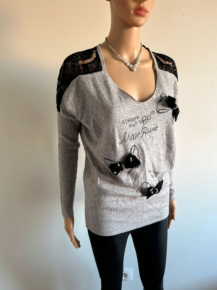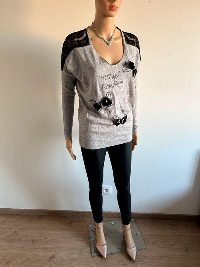 Petit pull gris et noir avec dentelle, à manches longues, de marque Morgan. Taille XS. Porté souvent, état satisfaisant. aisselle à aisselle 58 cms et plus taille 45 cms et plus longueur depuis épaule 62 cms Le tissu est extensible 40% coton, 35% laine et 25% cachemire (Boîte 8)