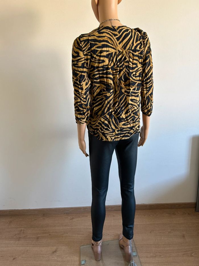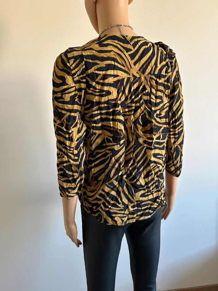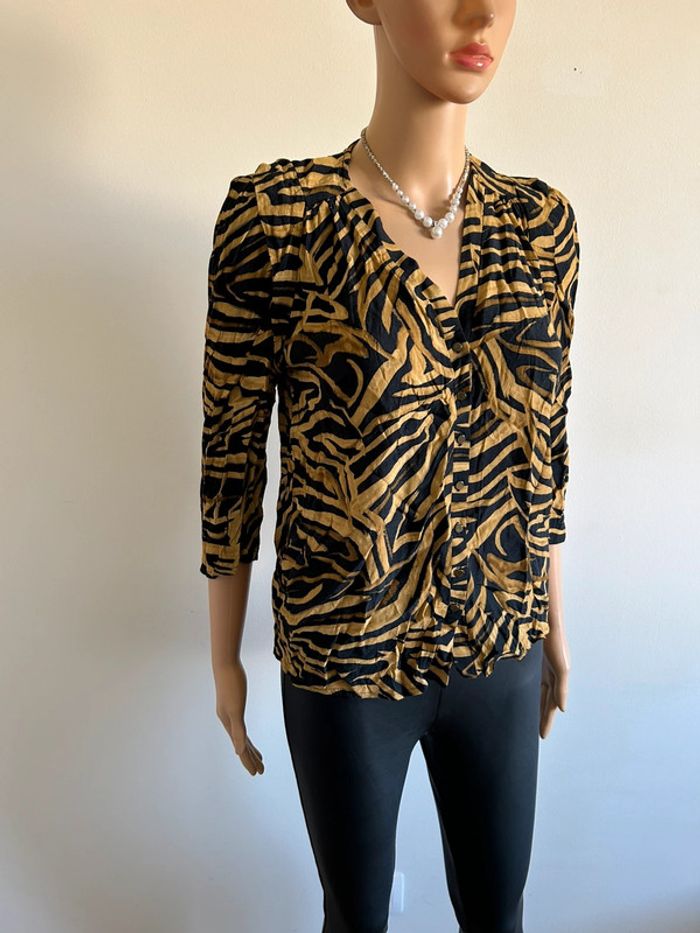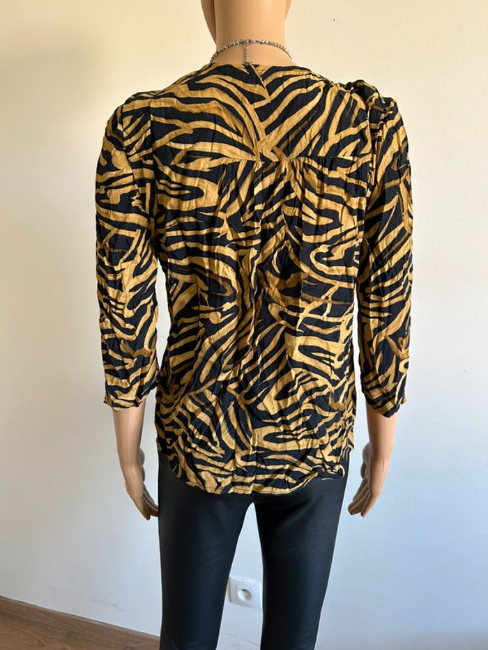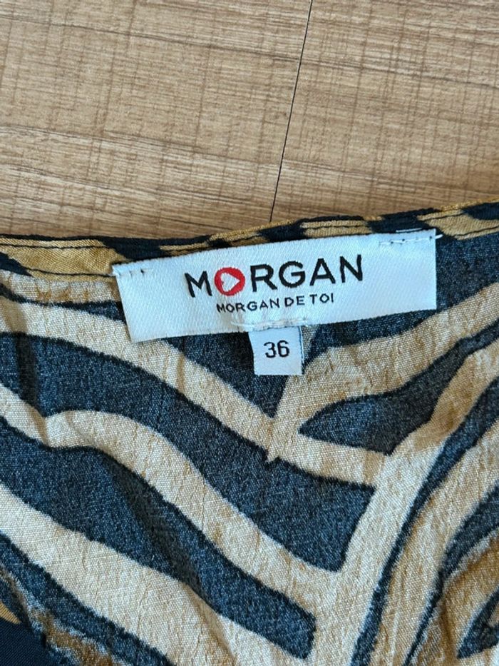 Jolie blouse imprimée beige et noire, avec manches 3/4, de marque Morgan. Taille 36. Peu portée, en très bon état. aisselle à aisselle 48 cms épaule à épaule 36 cms taille 42 cms longueur depuis épaule 59 cms Étiquette intérieure de composition coupée Le prix reste négociable dans la limite du raisonnable. Un petit cadeau dans le colis 🌸 (Boîte 51)