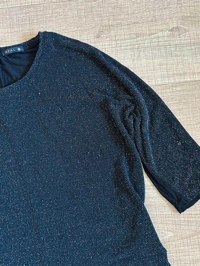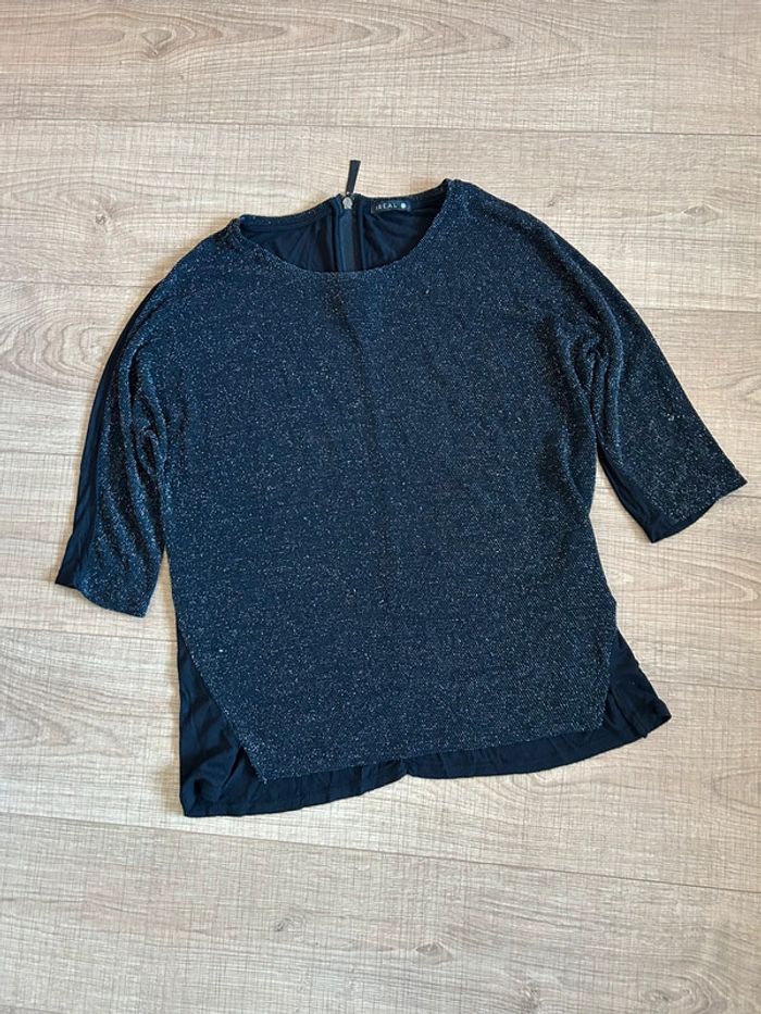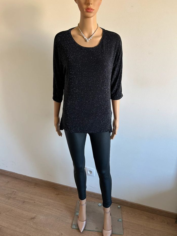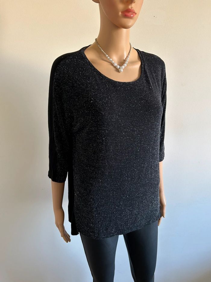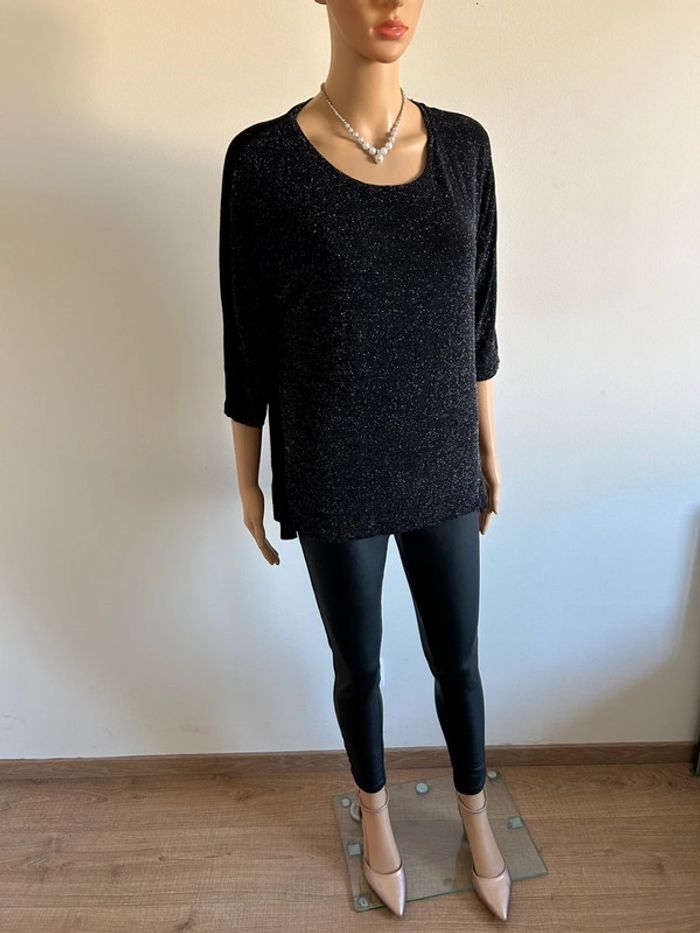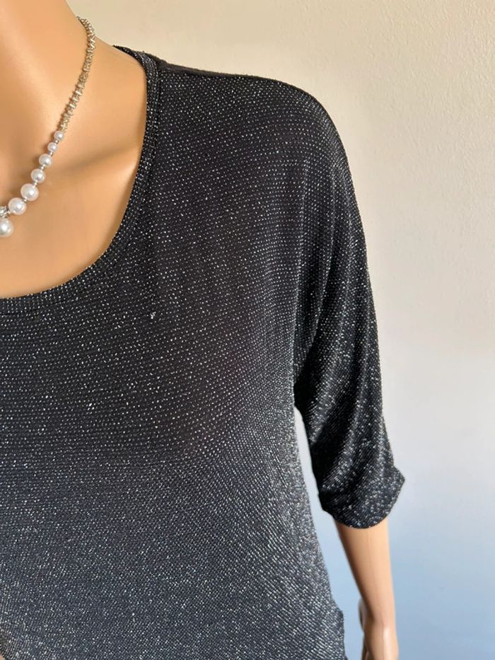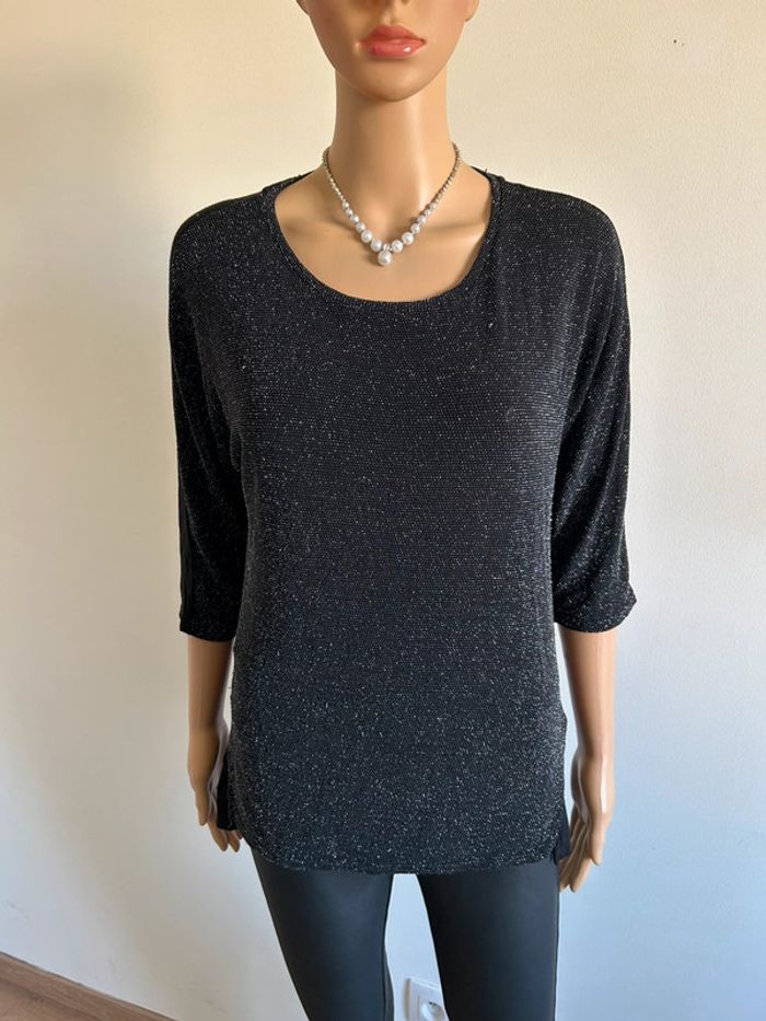 Joli haut noir et argenté pailleté, à manches courtes, de marque Breal. Taille 2 qui correspond à du 38. Porté plusieurs fois, en bon état. aisselle à aisselle 51 cms et plus taille 48 cms et plus longueur depuis épaule 60 cms à 64 cms Le tissu est extensible 92% polyamide, 5% elasthanne et 3% fil métallisé Le prix reste négociable dans la limite du raisonnable. Un petit cadeau dans le colis 🌸 (Boîte 51)