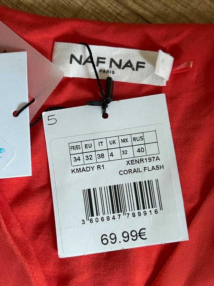 Magnifique robe rose corail à manches longues, de marque Naf Naf. Fermeture sur le côté. Taille 34. Elle est neuve avec étiquette (valeur 70€). aisselle à aisselle 41 cms épaule à épaule 35 cms longueur manches 62 cms taille 32 cms longueur depuis épaule 87 cms à 97 cms 100% polyester Le prix reste négociable dans la limite du raisonnable. Un petit cadeau dans le colis 🌸 (Boîte 13)