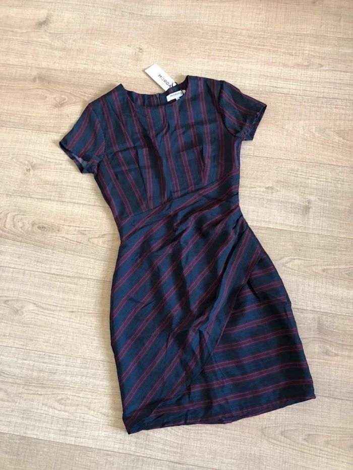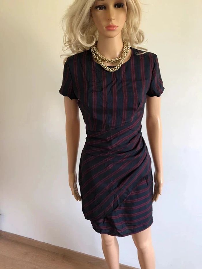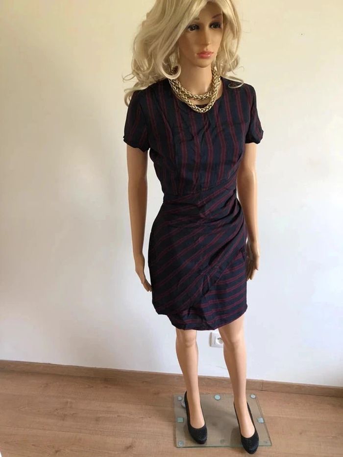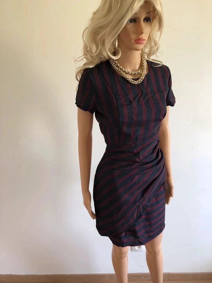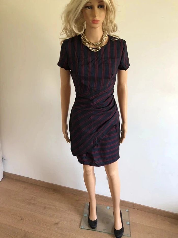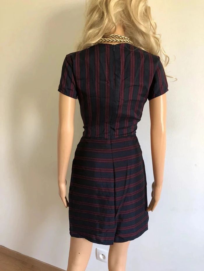 Magnifique robe bleue marine et tose à rayures, manches courtes, de marque Morgan. Fermeture dans le dos. Taille 36. Elle est neuve avec étiquette (valeur 65€). aisselle à aisselle 42 cms épaule à épaule 37 cms taille 34 cms longueur depuis épaule 90 cms 100% polyester Le prix reste négociable dans la limite du raisonnable. Un petit cadeau dans le colis. (Boîte 32)