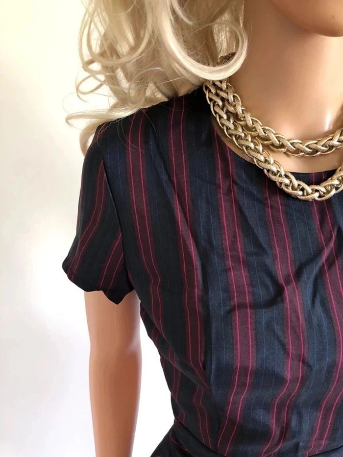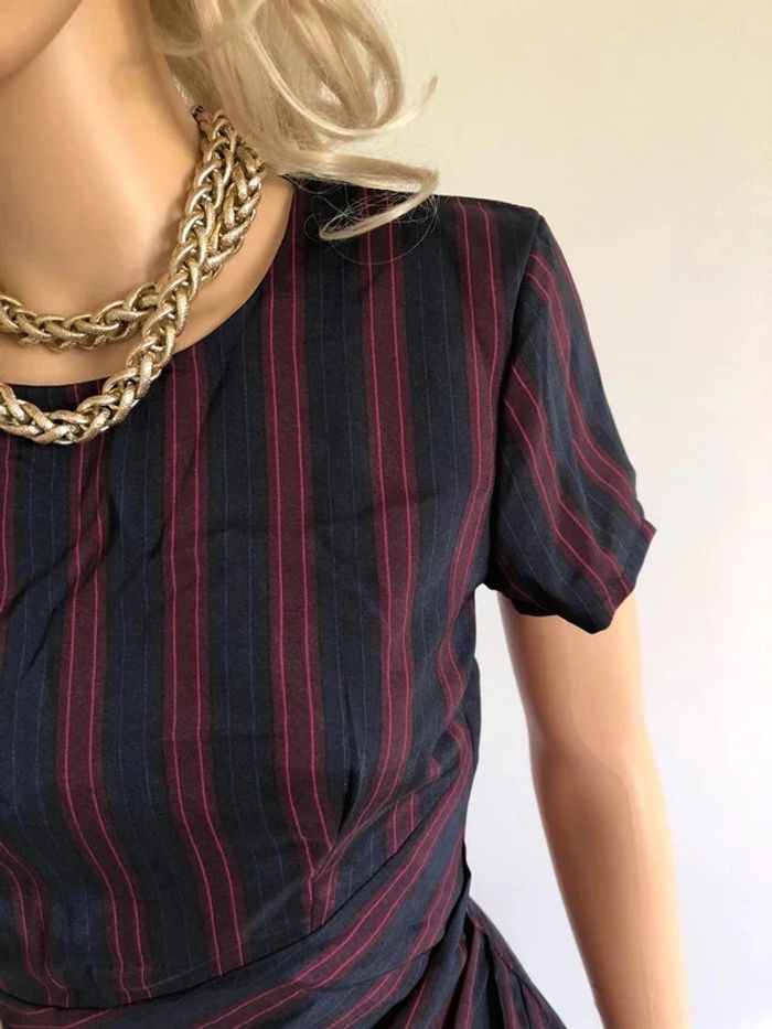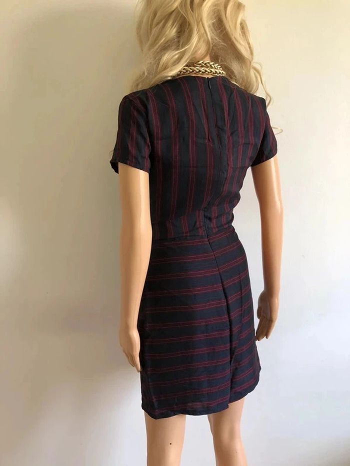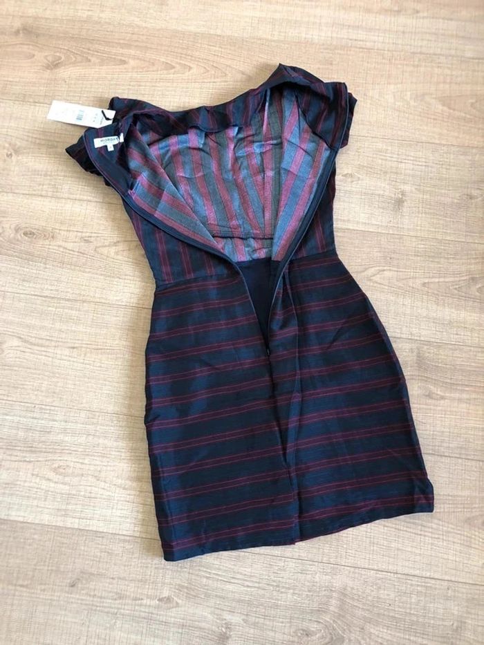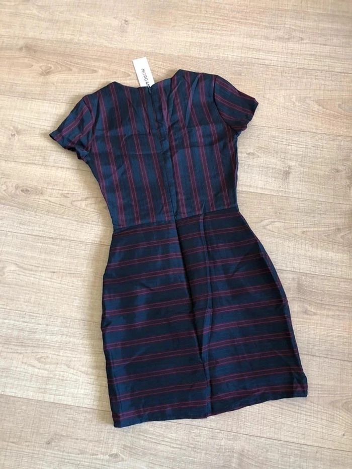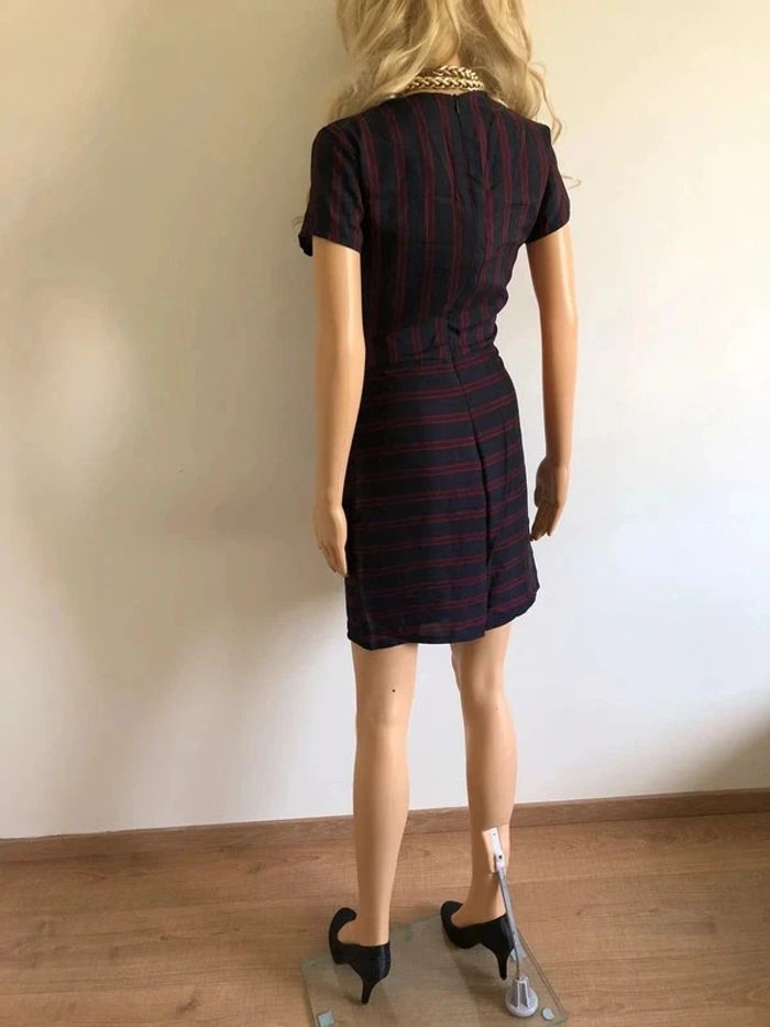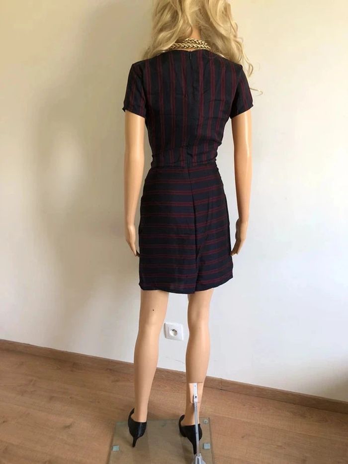 Magnifique robe bleue marine et tose à rayures, manches courtes, de marque Morgan. Fermeture dans le dos. Taille 36. Elle est neuve avec étiquette (valeur 65€). aisselle à aisselle 42 cms épaule à épaule 37 cms taille 34 cms longueur depuis épaule 90 cms 100% polyester Le prix reste négociable dans la limite du raisonnable. Un petit cadeau dans le colis. (Boîte 32)