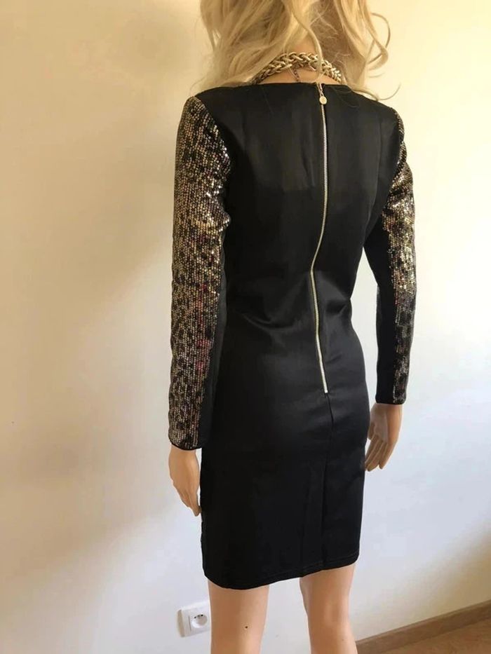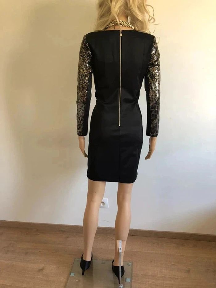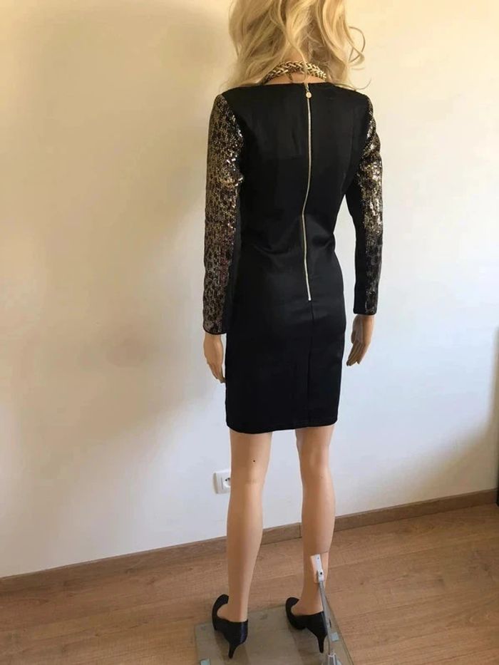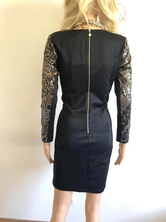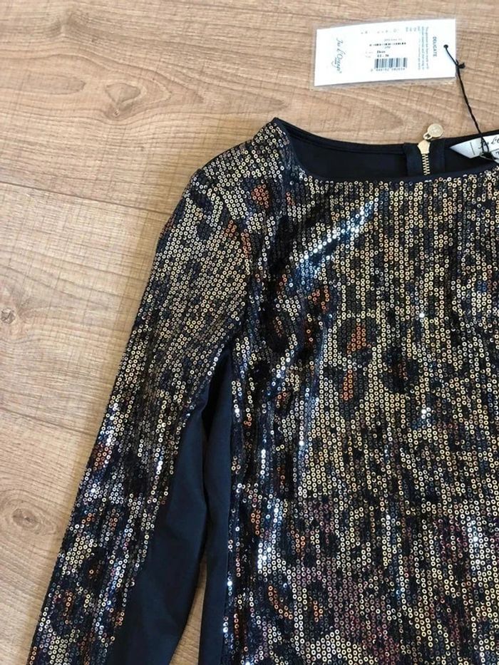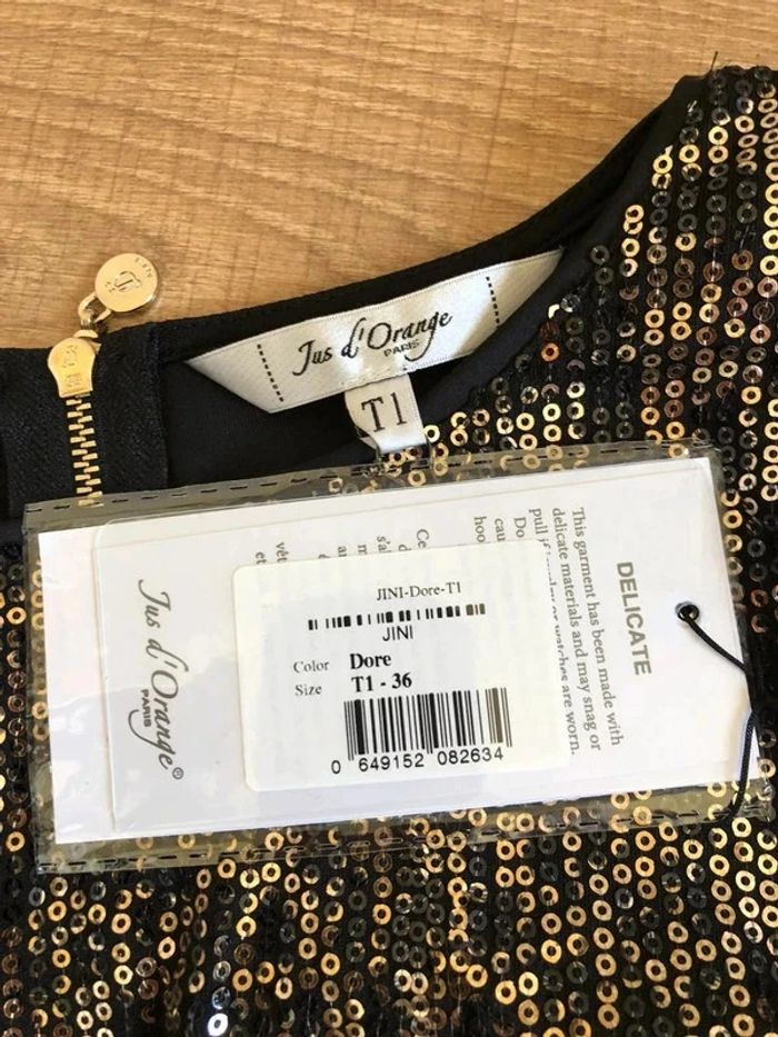 Magnifique robe noire et dorée avec sequins, à manches longues, de marque Jus d’Orange. Fermeture dans le dos. Taille 1 qui correspond à du 36. Elle est neuve avec étiquette. aisselle à aisselle 41 cms à 46 cms épaule à épaule 35 cms à 39 cms longueur manches 52 cms taille 37 cms à 40 cms longueur depuis épaule 87 cms Le tissu est extensible 100% polyester Le prix reste négociable dans la limite du raisonnable. Un petit cadeau accompagnera cet achat 😊 (Boîte 36)