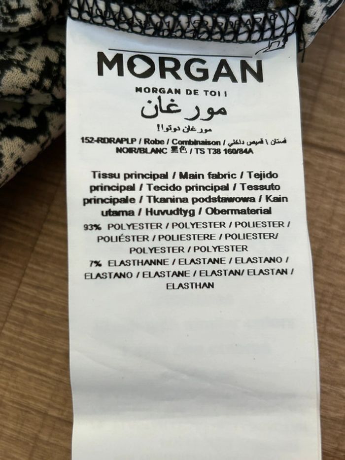 Jolie robe imprimée noire et beige avec manches 3/4, de marque Morgan. Taille S. Elle est neuve avec étiquette. aisselle à aisselle 43 cms et plus épaule à épaule 37 cms taille 37 cms et plus longueur depuis épaule 92 cms Le tissu est extensible 93% polyester et 7% elasthanne Le prix reste négociable dans la limite du raisonnable. Un petit cadeau dans le colis 🌸