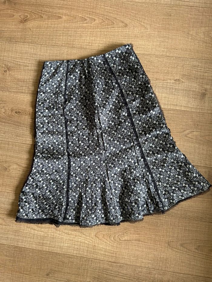 Jolie jupe imprimée grise argentée en soie, de marque Gérard Darel. Fermeture à l’arrière. Taille 38 mais qui taille petit (voir mesures en dessous). Jamais portée, état neuf. taille 34 cms longueur 61 cms 100% soie Le prix reste négociable dans la limite du raisonnable. Un petit cadeau dans le colis 🌸
