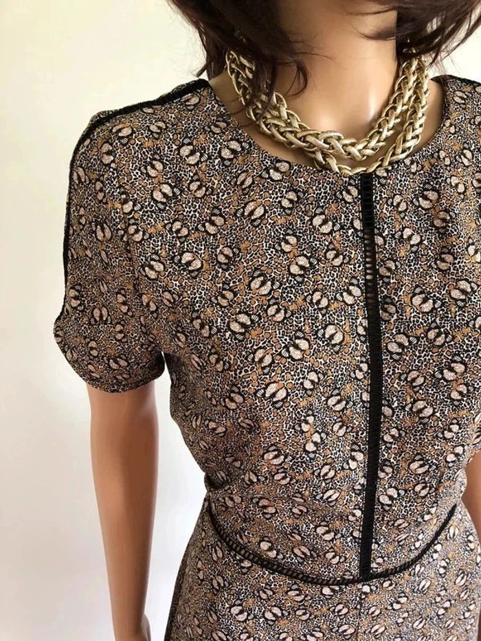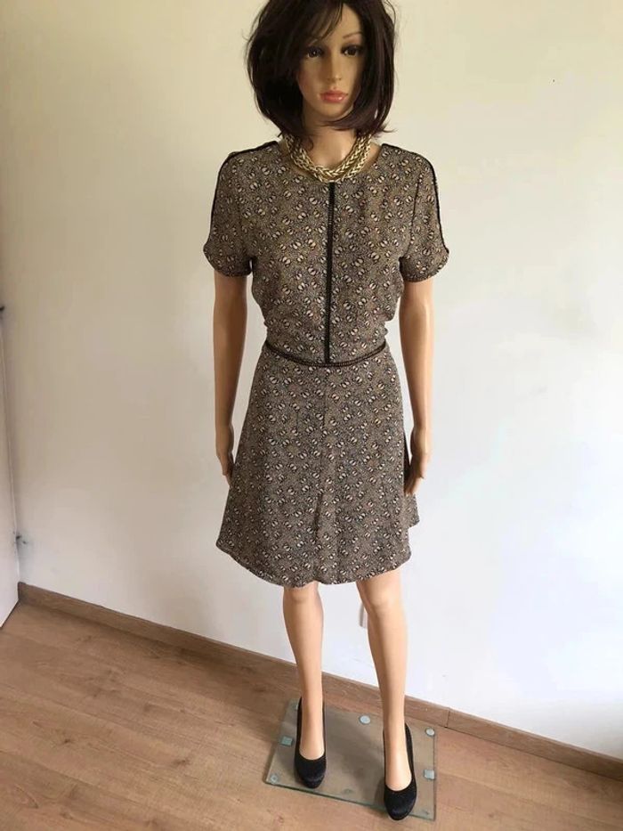 Magnifique robe imprimée beige et noire à manches courtes, de marque Morgan. Fermeture dans le dos. Taille 40. Elle est neuve avec étiquette (valeur 70€). aisselle à aisselle 48 cms épaule à épaule 37 cms taille 39 cms longueur depuis épaule 92 cms 97% polyester et 3% elasthanne Le prix reste négociable dans la limite du raisonnable. Un petit cadeau dans le colis.