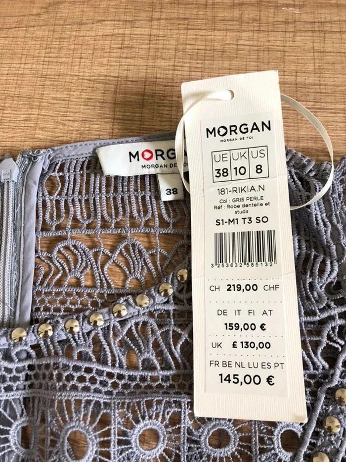 Magnifique robe grise bleutée en dentelle, a manches courtes,de marque Morgan. Fermeture dans le dos. Taille 38 qui taille petit (voir mesures en dessous). Elle est neuve avec étiquette (valeur 145€). aisselle à aisselle 42 cms épaule à épaule 37 cms taille 36 cms longueur depuis épaule 87 cms 100% polyester Le prix reste négociable dans la limite du raisonnable. Un petit cadeau dans le colis.