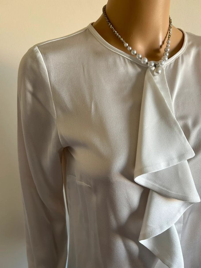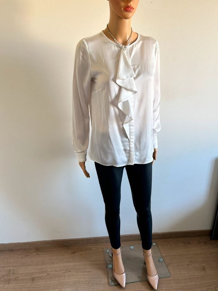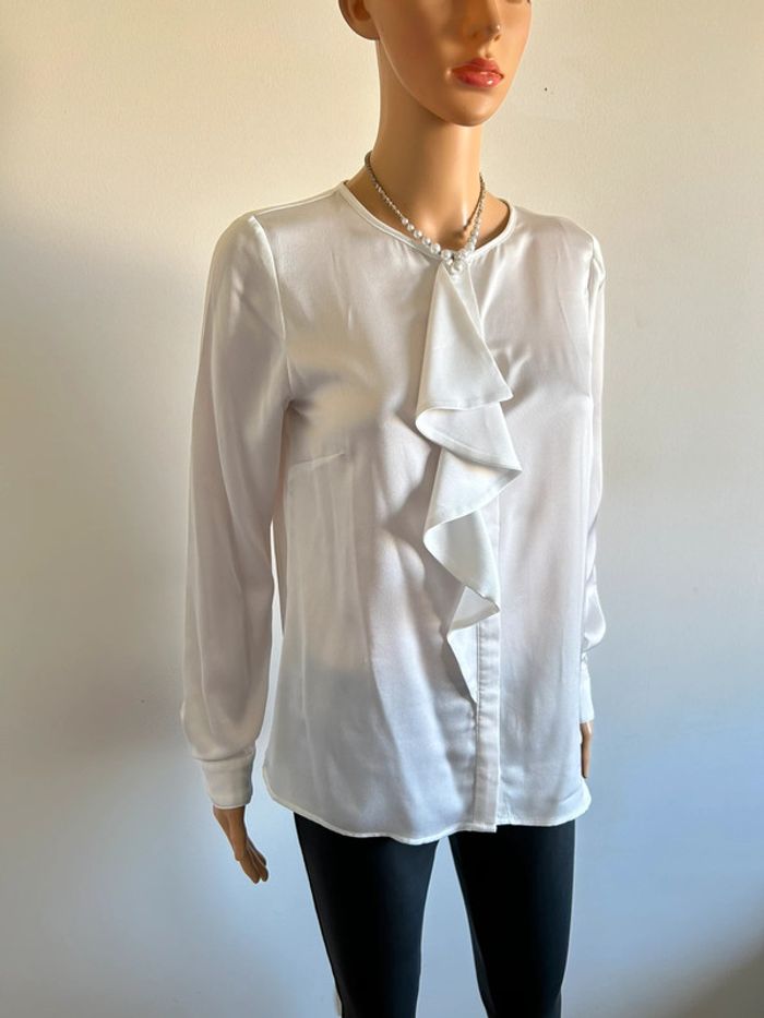 Jolie blouse blanche satinée à manches longues, de marque Kookai. Taille 36. Jamais portée, état neuf. aisselle à aisselle 48 cms épaule à épaule 37 cms longueur manches 62 cms taille 46 cms longueur depuis épaule 63 cms Étiquette intérieure de composition coupée Le prix reste négociable dans la limite du raisonnable. Un petit cadeau dans le colis 🌸 (Boîte 51)