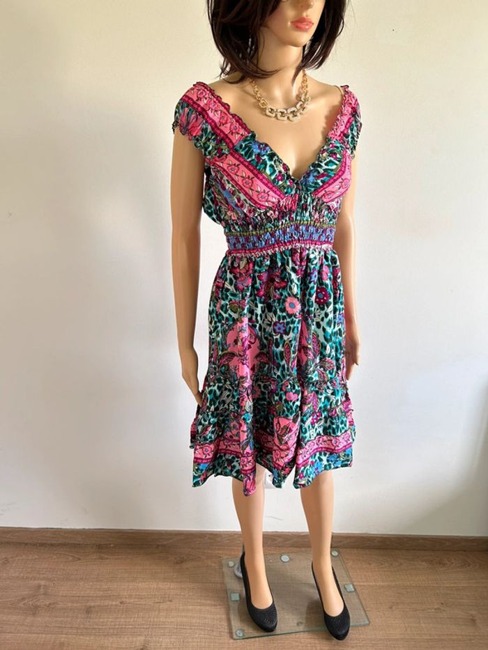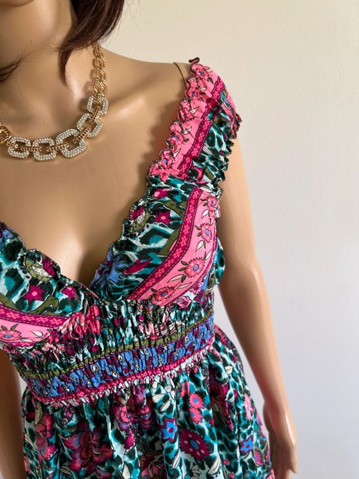 Magnifique robe imprimée mi longue en soie, sans manches, de marque Trebol. Taille S. Elle est neuve avec étiquette. aisselle à aisselle 35 cms à 47 cms taille 25 cms à 47 cms longueur depuis épaule 87 cms Le tissu est extensible 70% soie et 30% polyester Le prix reste négociable dans la limite du raisonnable. Un petit cadeau dans le colis 🌸