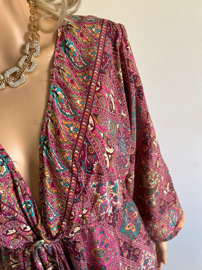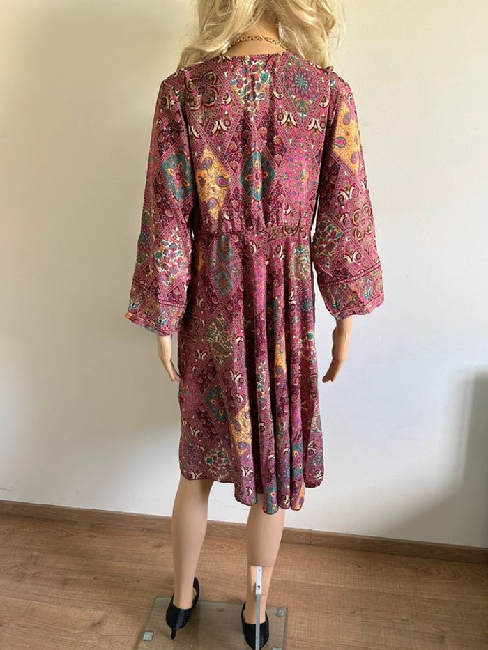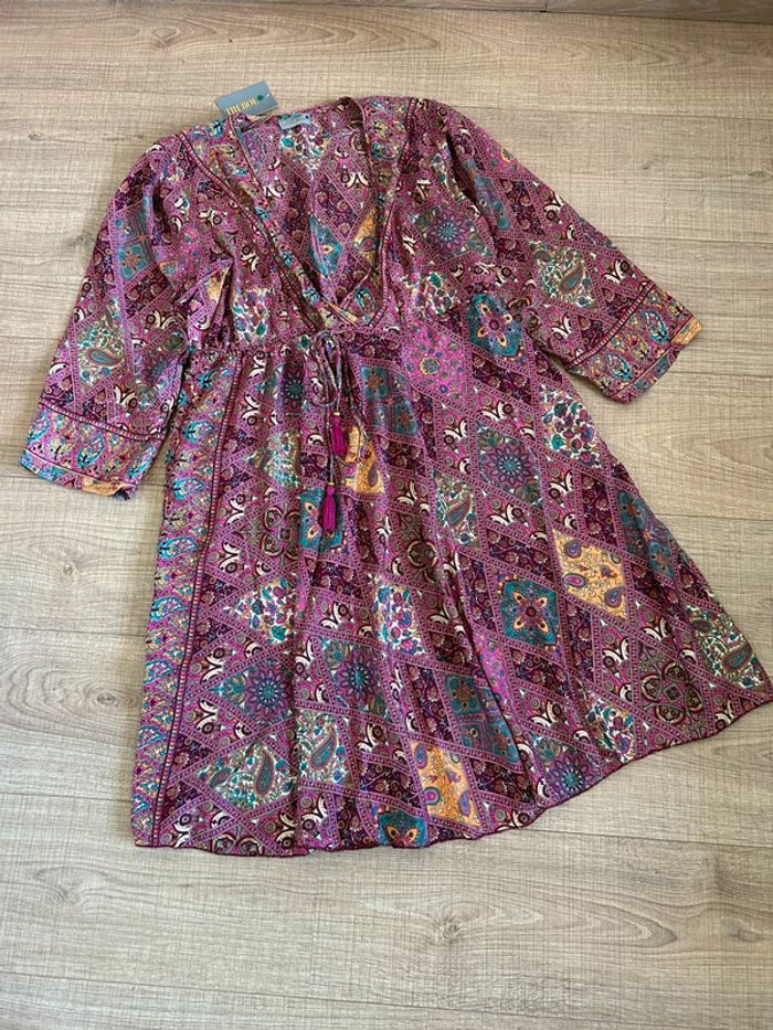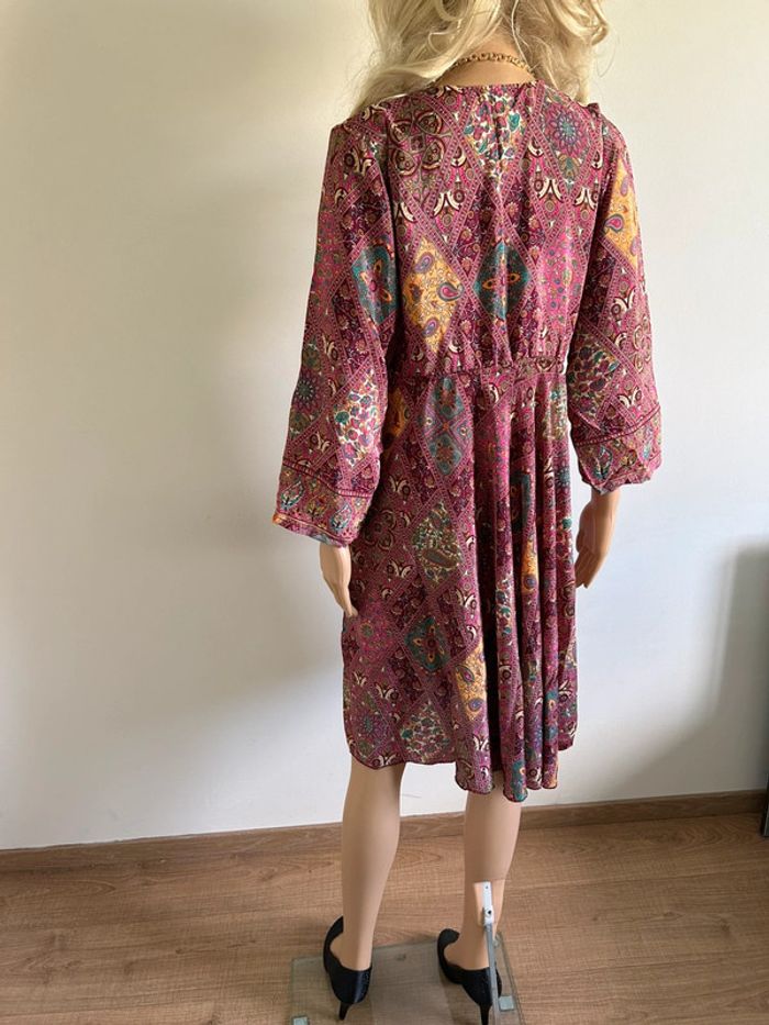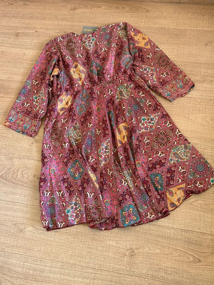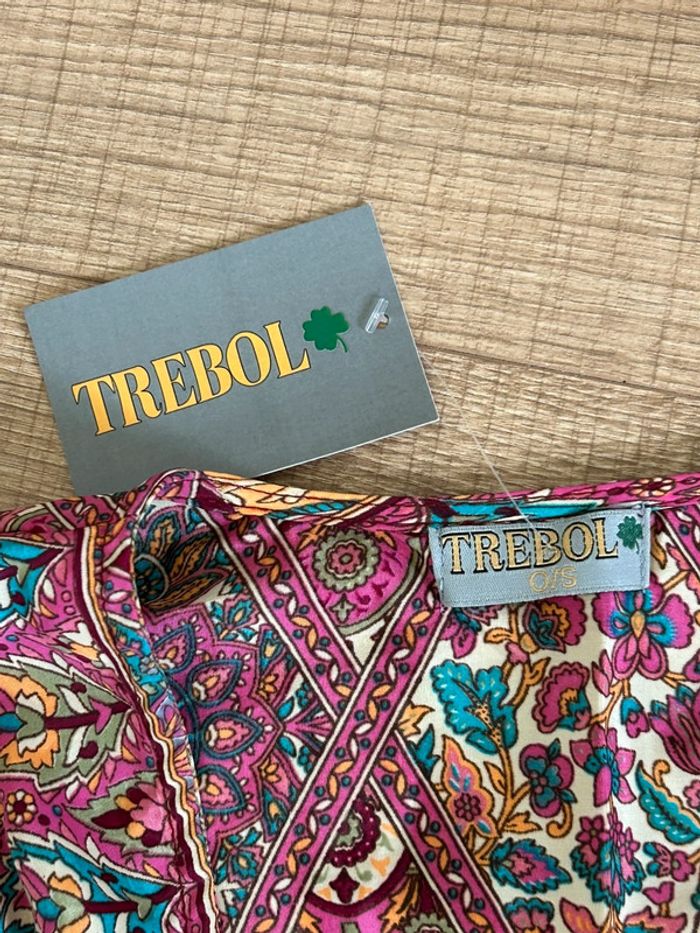 Magnifique robe imprimée mi longue en soie, de marque Trebol. Taille S. Elle est neuve avec étiquette. aisselle à aisselle 54 cms épaule à épaule 38 cms longueur manches 51 cms taille 45 cms longueur depuis épaule 99 cms 70% soie et 30% polyester Le prix reste négociable dans la limite du raisonnable. Un petit cadeau dans le colis 🌸