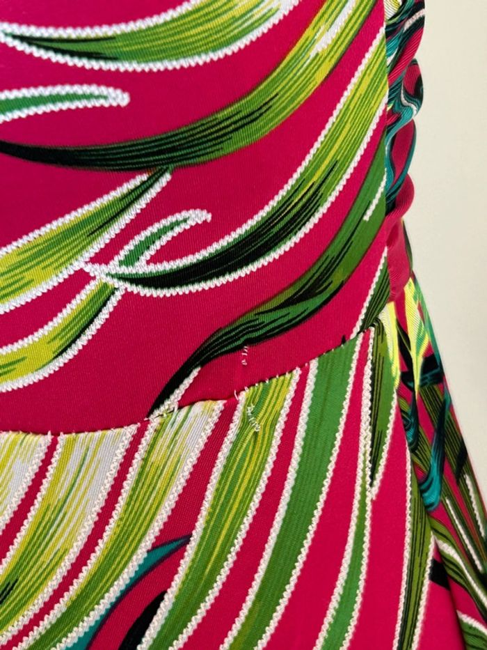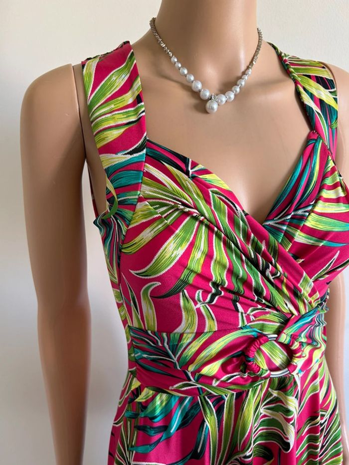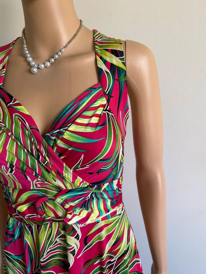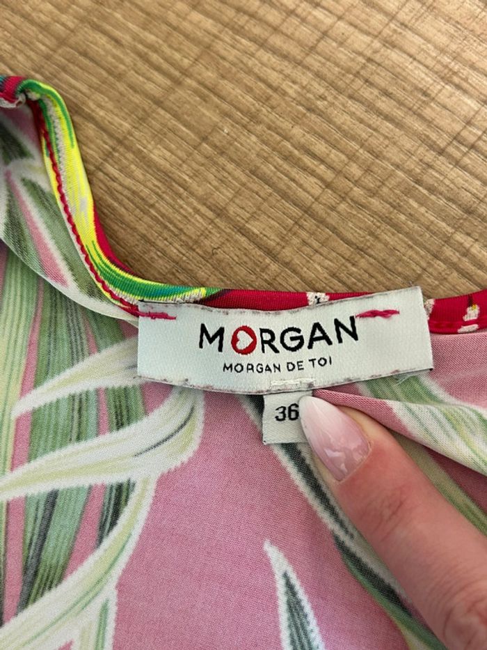 Jolie robe imprimée multicolore sans manches, de marque Morgan. Taille 36. Peu portée mais présente un défaut : deux petits accrocs en bas du dos, qui se voient peu quand la robe est portée. aisselle à aisselle 37 cms à 45 cms taille 31 cms à 39 cms longueur depuis épaule 85 cms Le tissu est extensible Étiquette intérieure de composition coupée