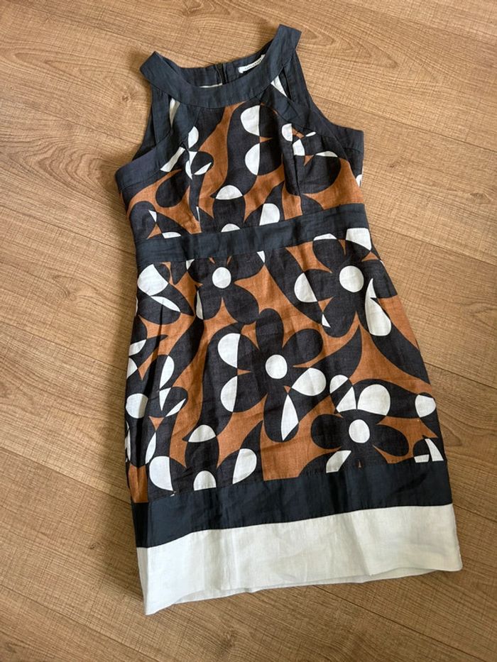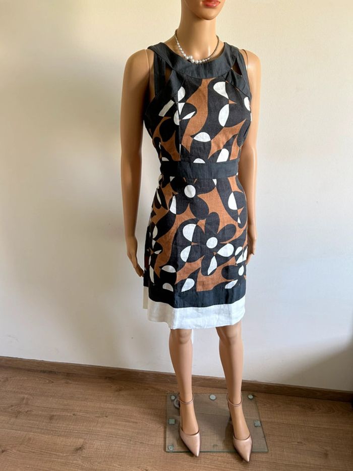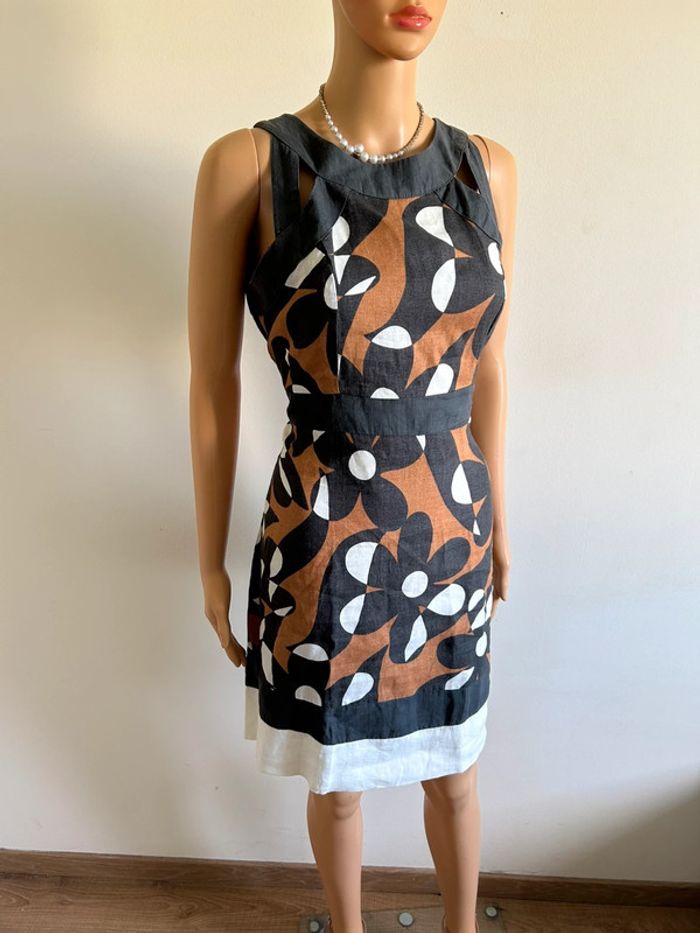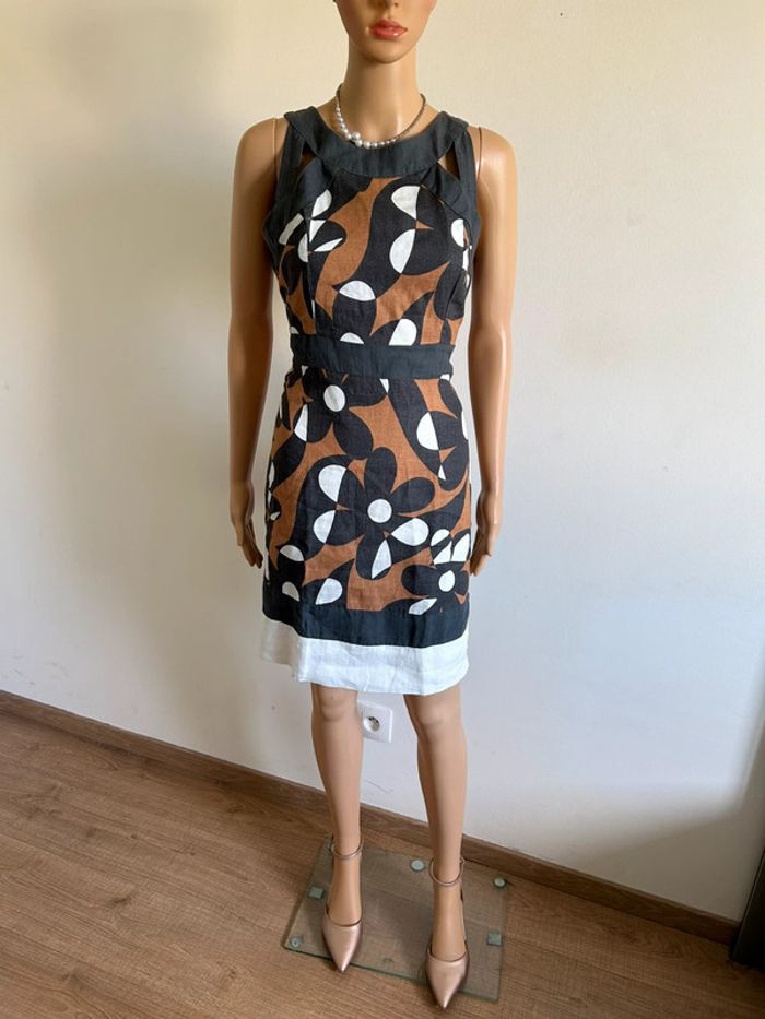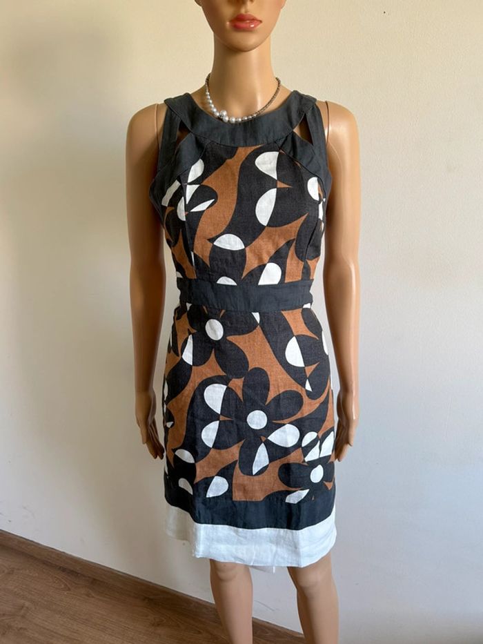 Jolie robe imprimée en lin, sans manches, de marque LolaLiza. Fermeture dans le dos. Taille 38. Portée quelques fois, en très bon état. aisselle à aisselle 46 cms taille 41 cms longueur depuis épaule 92 cms 100% lin Le prix reste négociable dans la limite du raisonnable. Un petit cadeau dans le colis 🌸