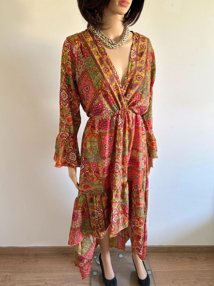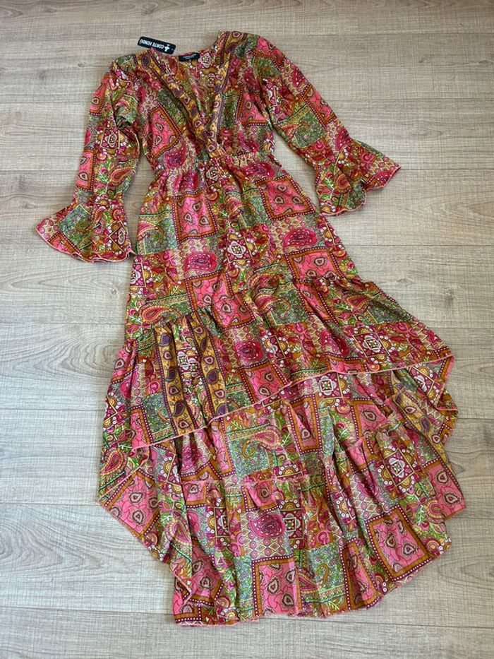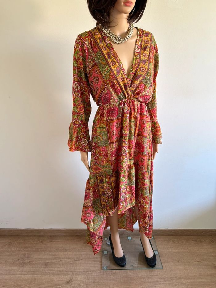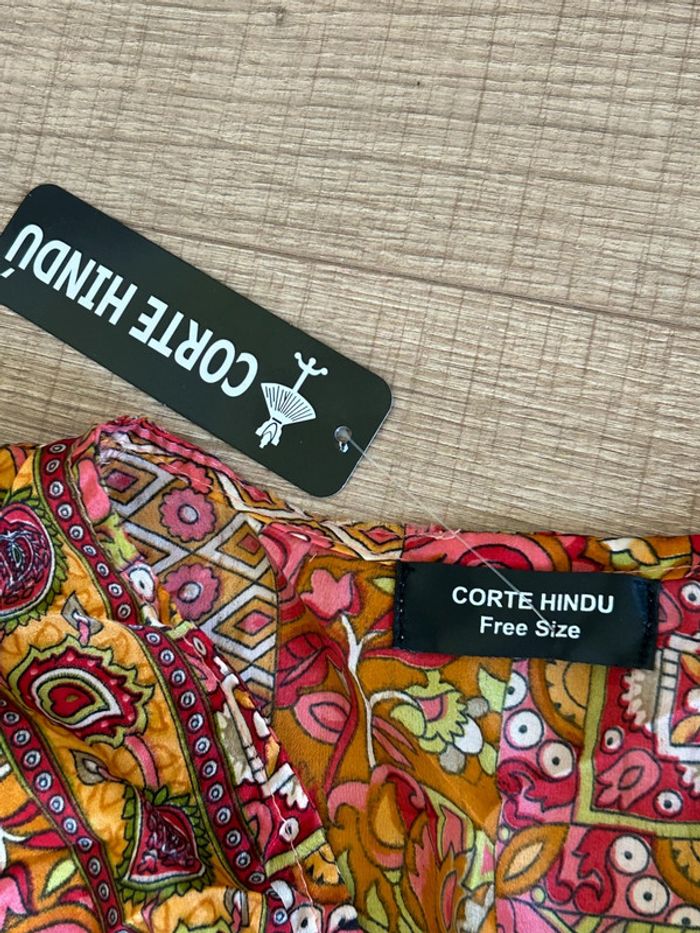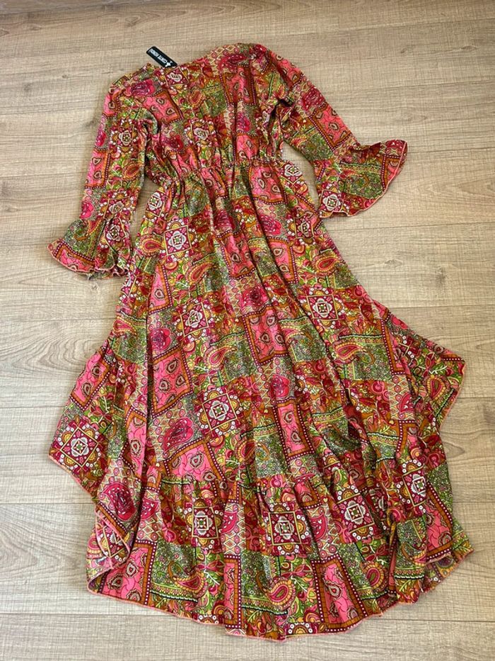 Magnifique robe longue imprimée de marque Corte Hindu. Plus courte devant que derrière. Taille unique qui convient jusqu’au 38. Elle est neuve avec étiquette. aisselle à aisselle 46 cms épaule à épaule 39 cms longueur manches 53 cms taille 30 cms à 41 cms longueur avant depuis épaule 96 cms longueur arrière depuis épaule 141 cms La taille est extensible Le prix reste négociable dans la limite du raisonnable. Un petit cadeau dans le colis 🌸
