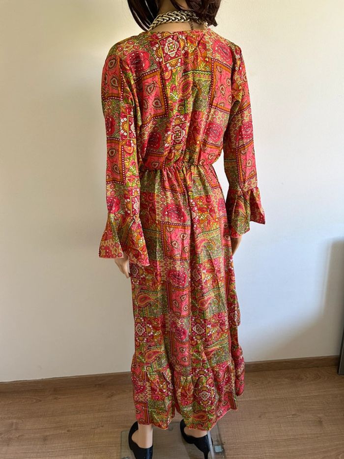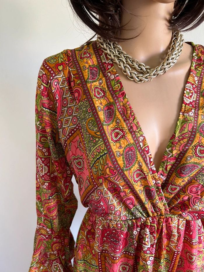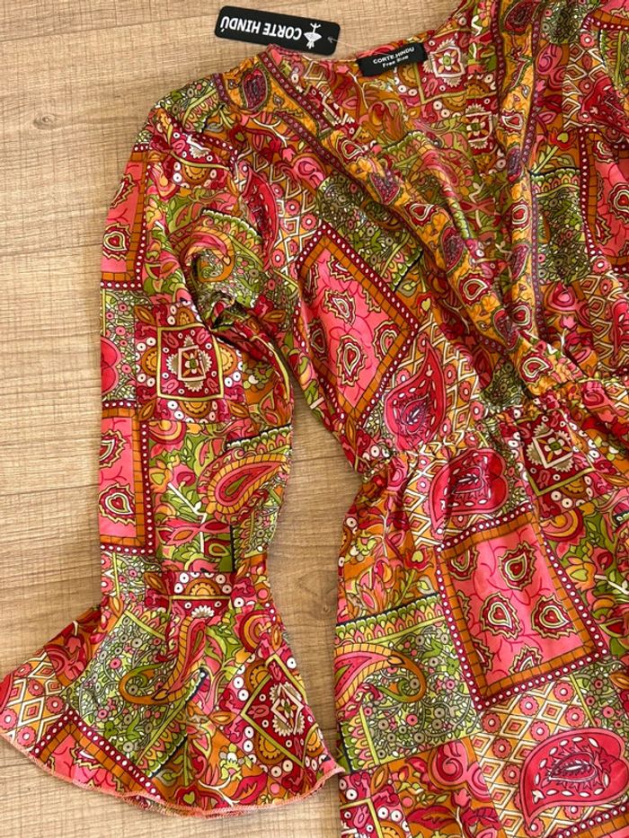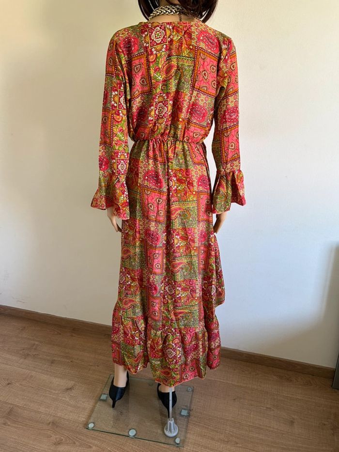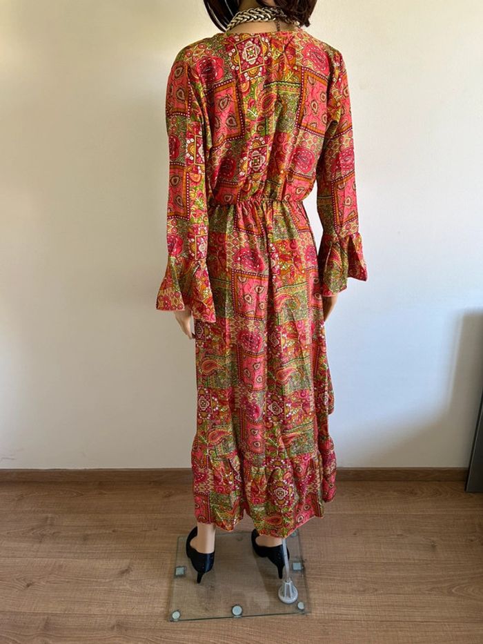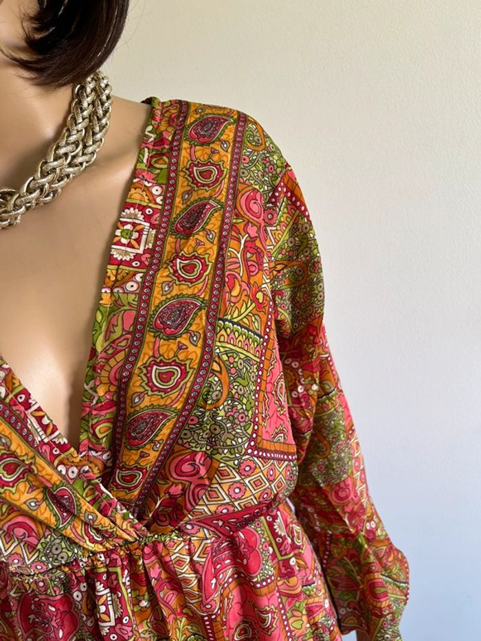 Magnifique robe longue imprimée de marque Corte Hindu. Plus courte devant que derrière. Taille unique qui convient jusqu’au 38. Elle est neuve avec étiquette. aisselle à aisselle 46 cms épaule à épaule 39 cms longueur manches 53 cms taille 30 cms à 41 cms longueur avant depuis épaule 96 cms longueur arrière depuis épaule 141 cms La taille est extensible Le prix reste négociable dans la limite du raisonnable. Un petit cadeau dans le colis 🌸