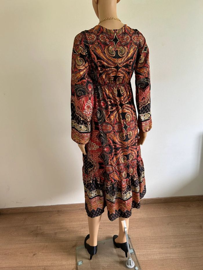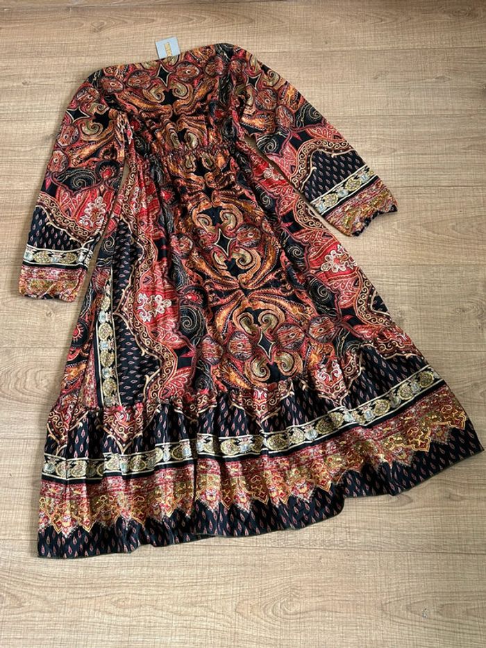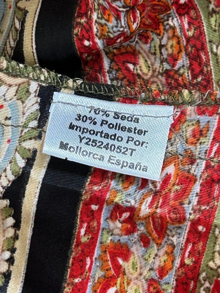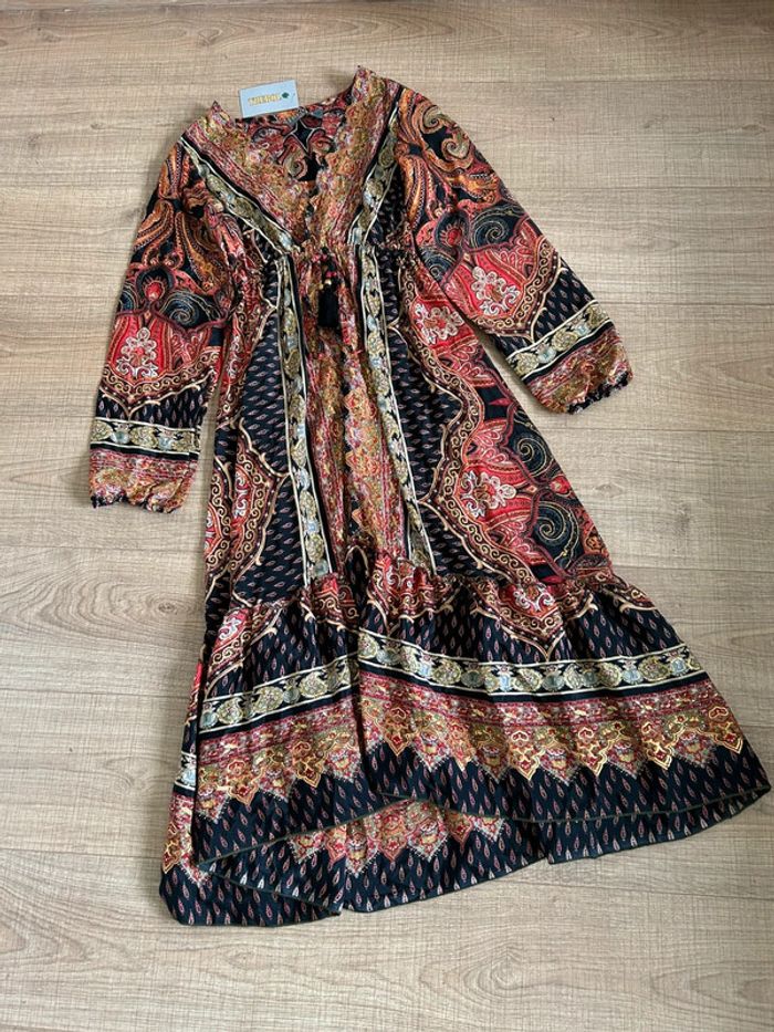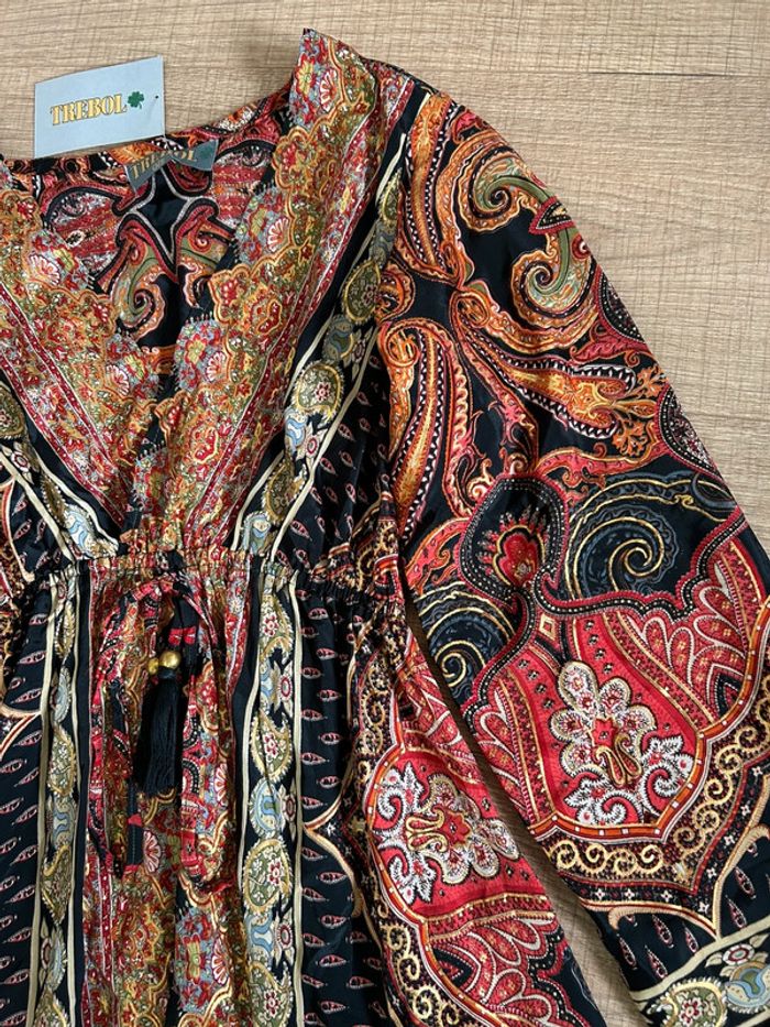 Magnifique robe longue imprimée en soie, de marque Trebol. Taille S. Elle est neuve avec étiquette. aisselle à aisselle 40 cms à 50 cms épaule à épaule 38 cms longueur manches 59 cms taille 28 cms à 47 cms longueur depuis épaule environ 107 cms à 119 cms La taille est extensible 70% soie et 30% polyester Le prix reste négociable dans la limite du raisonnable. Un petit cadeau dans le colis 🌸