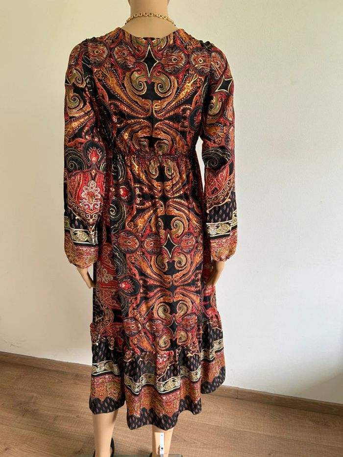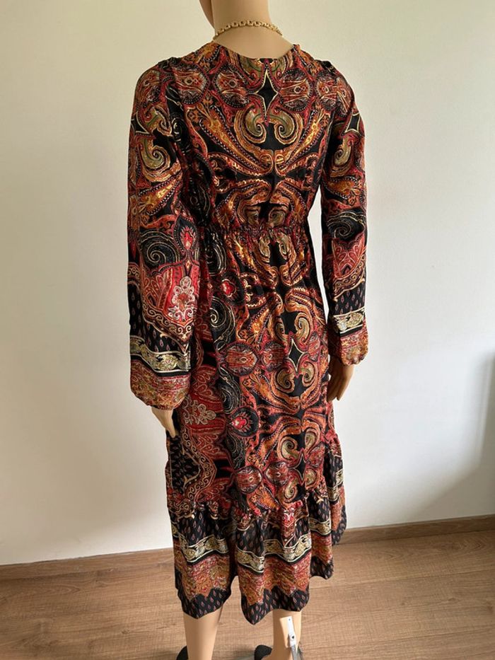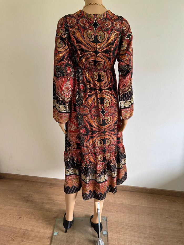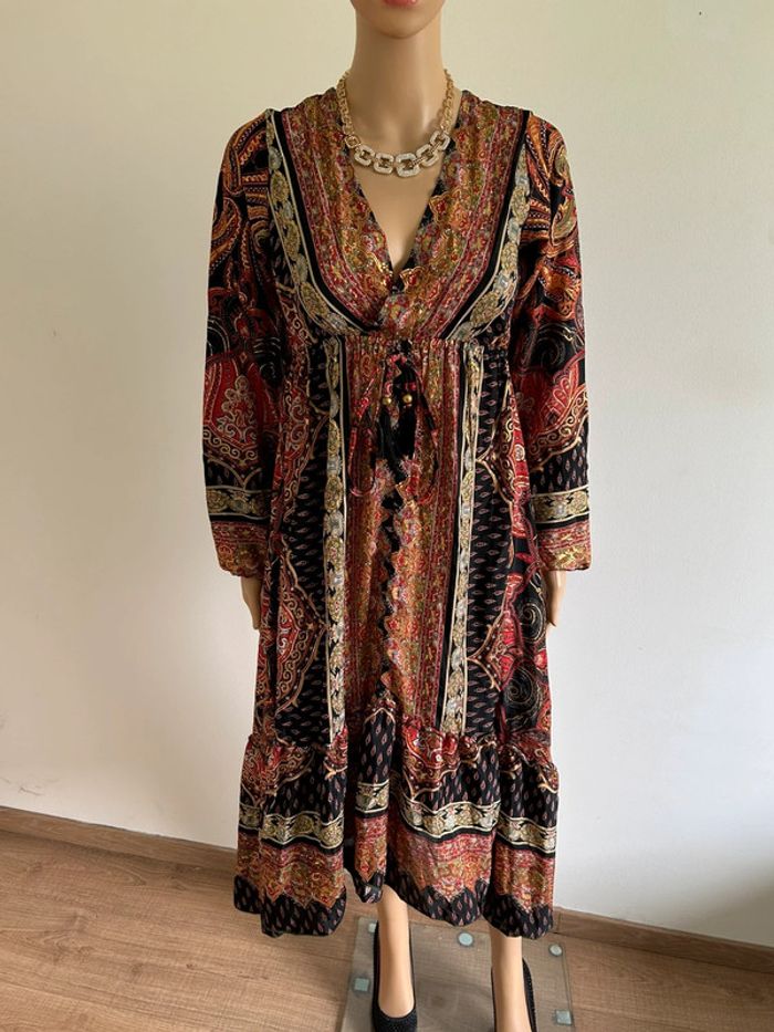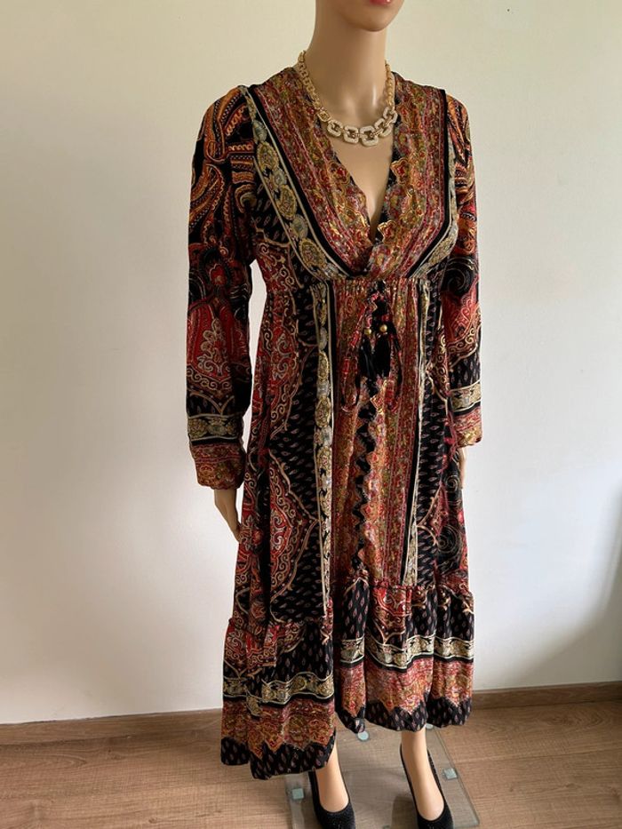 Magnifique robe longue imprimée en soie, de marque Trebol. Taille S. Elle est neuve avec étiquette. aisselle à aisselle 40 cms à 50 cms épaule à épaule 38 cms longueur manches 59 cms taille 28 cms à 47 cms longueur depuis épaule environ 107 cms à 119 cms La taille est extensible 70% soie et 30% polyester Le prix reste négociable dans la limite du raisonnable. Un petit cadeau dans le colis 🌸