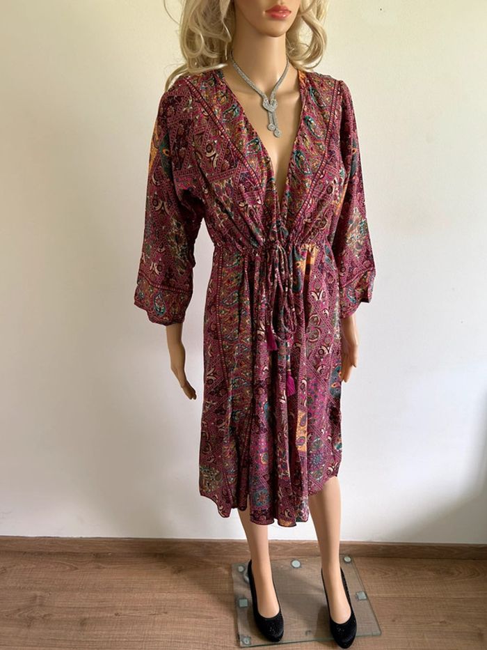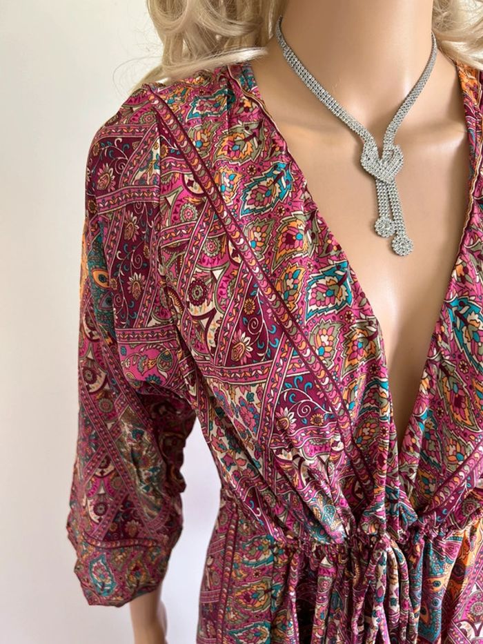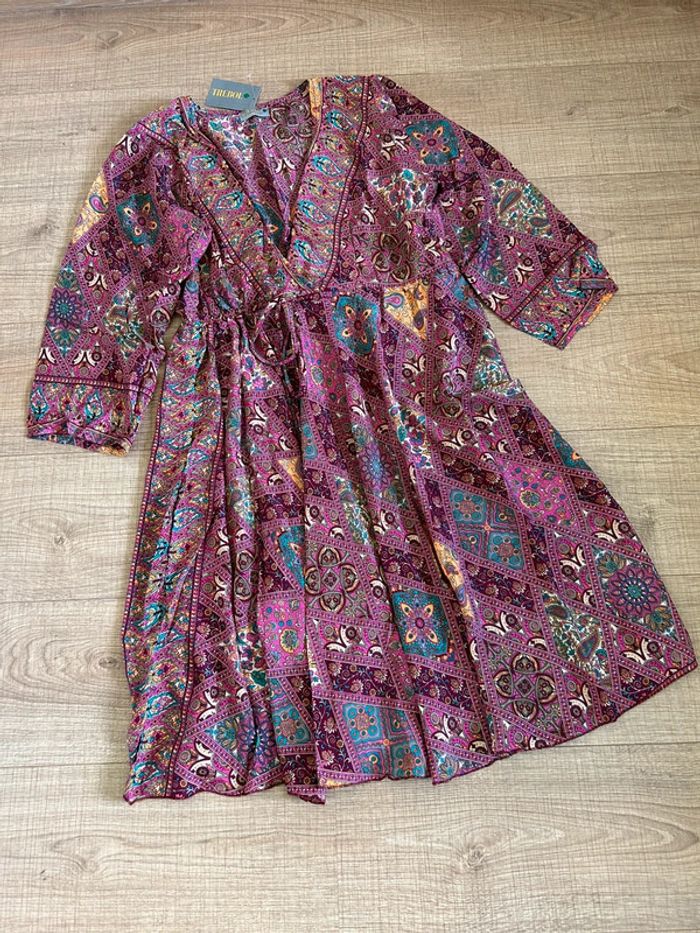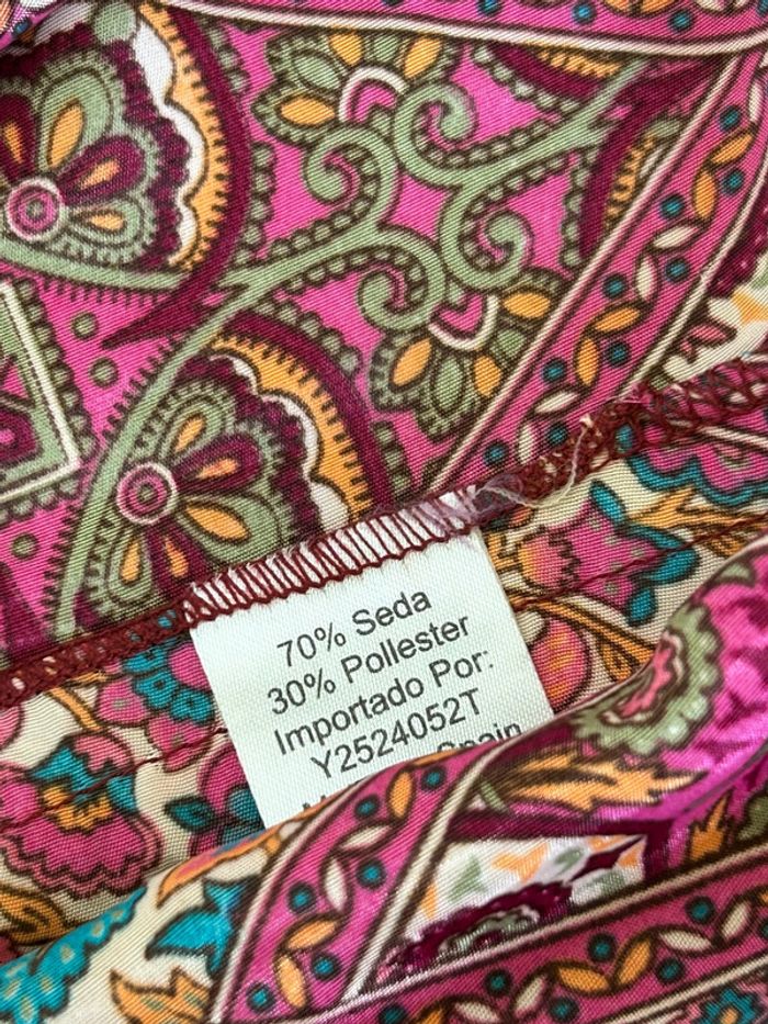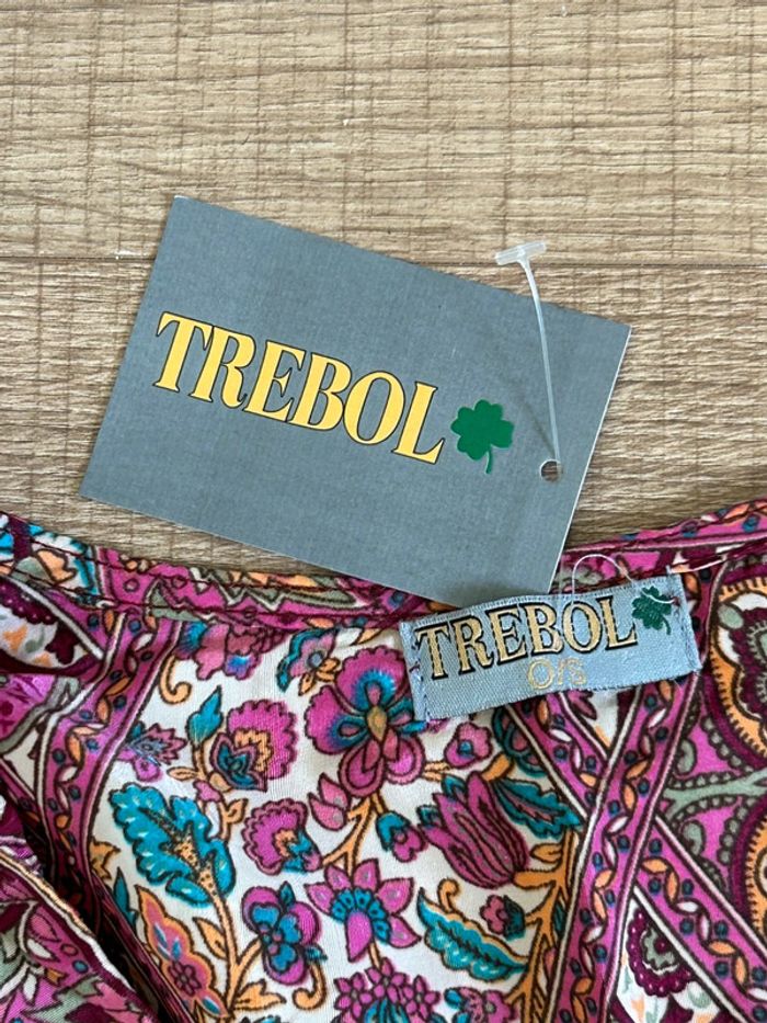 Magnifique robe mi longue imprimée en soie, de marque Trebol. Taille S. Elle est neuve avec étiquette. aisselle à aisselle 54 cms épaule à épaule 37 cms taille 47 cms longueur depuis épaule environ 99 cms 70% soie et 30% polyester Le prix reste négociable dans la limite du raisonnable. Un petit cadeau dans le colis 🌸