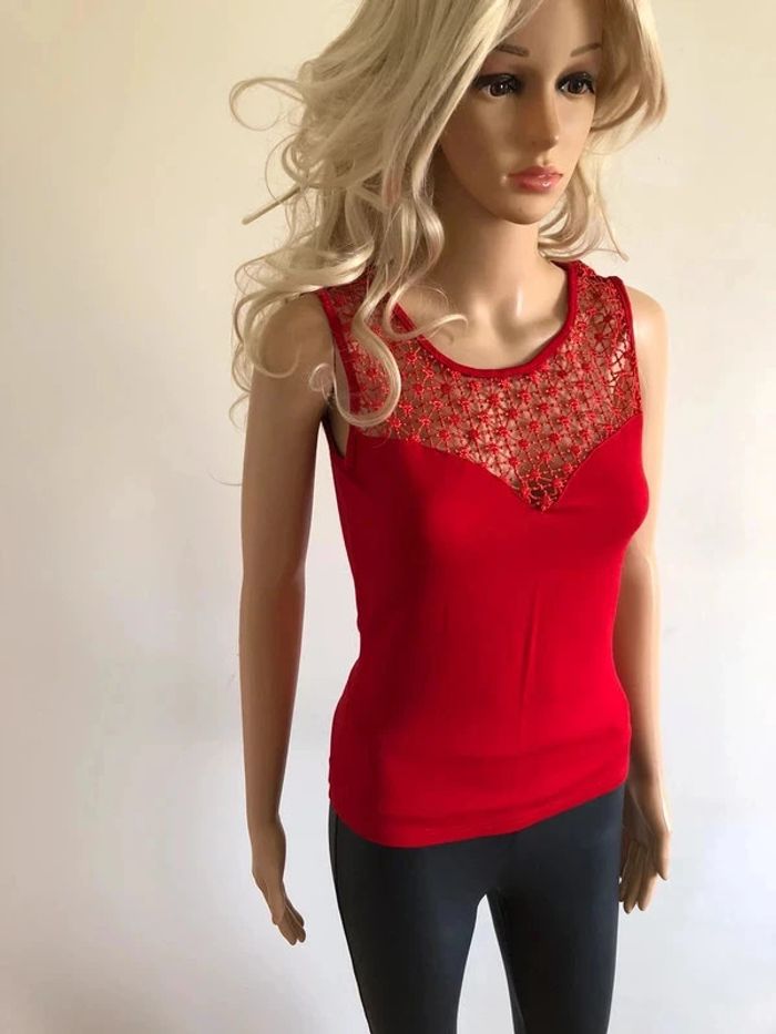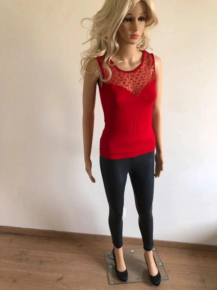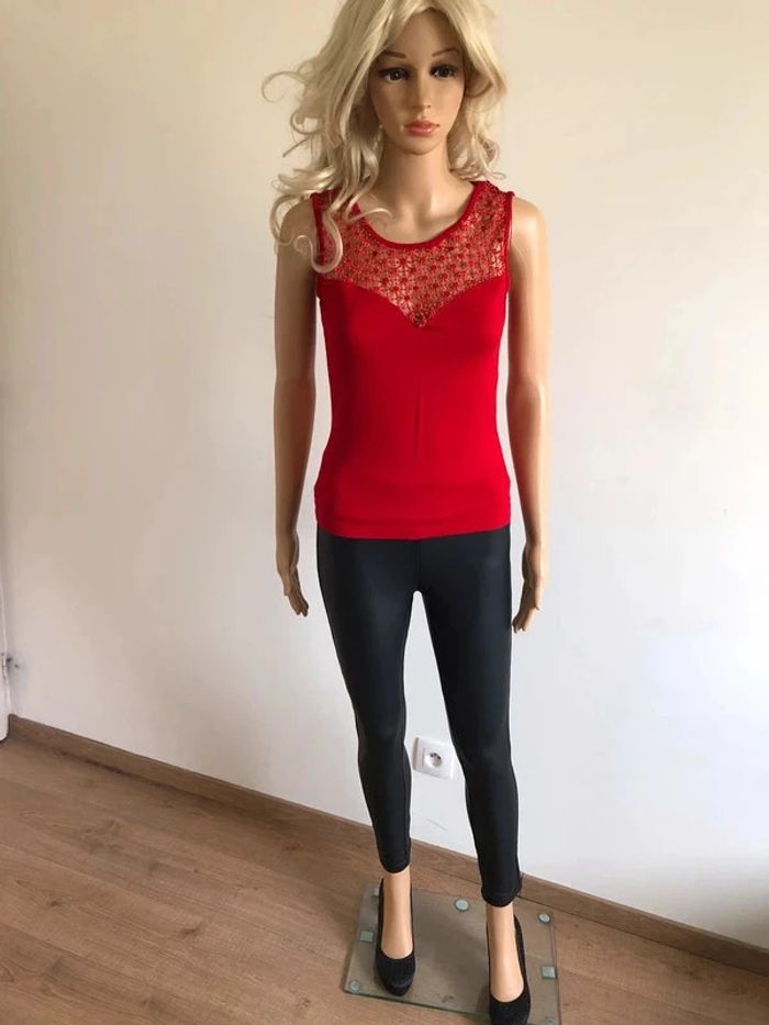 Joli top rouge sans manches, avec dentelle et sequins au niveau du décolleté, de marque Morgan. Taille S. Porté une fois, en excellent état. aisselle à aisselle 39 cms à 45 cms taille 34 cms à 38 cms longueur depuis épaule 53 cms Le tissu est extensible Étiquette intérieure de composition coupée Le prix reste négociable dans la limite du raisonnable. Un petit cadeau dans le colis.