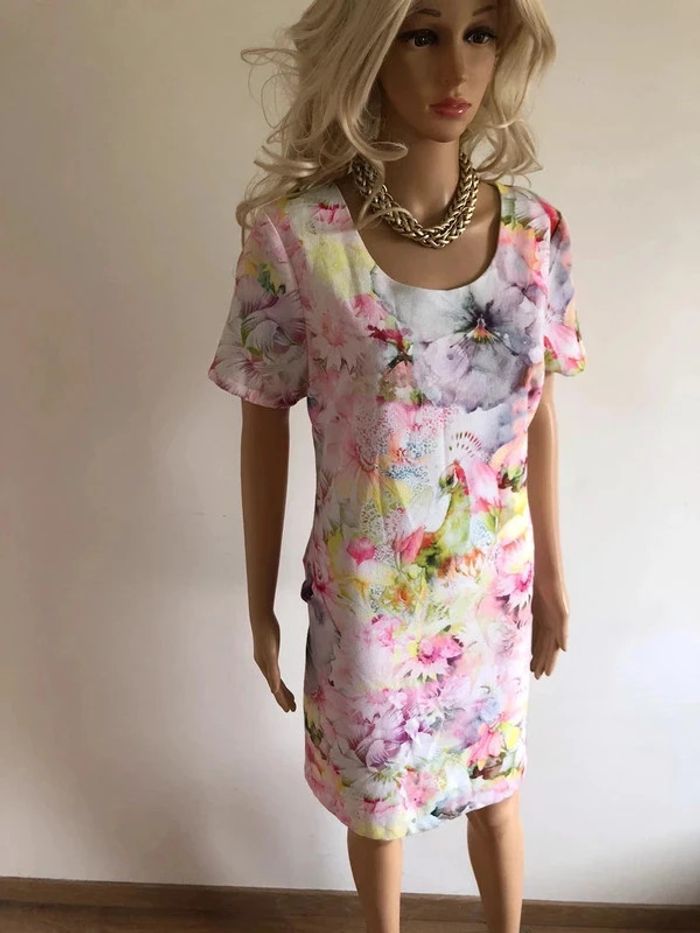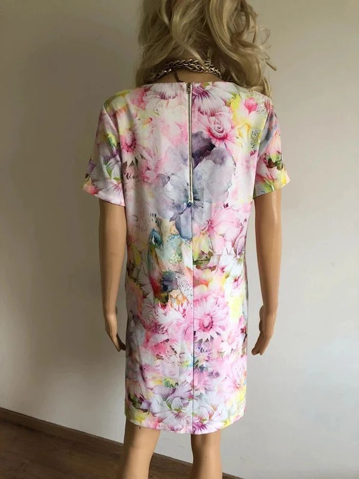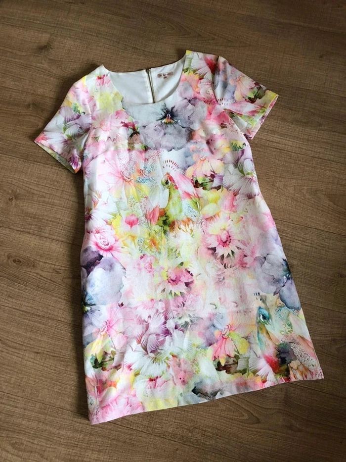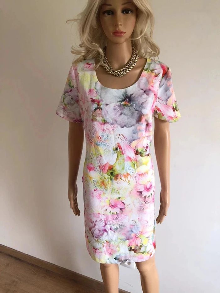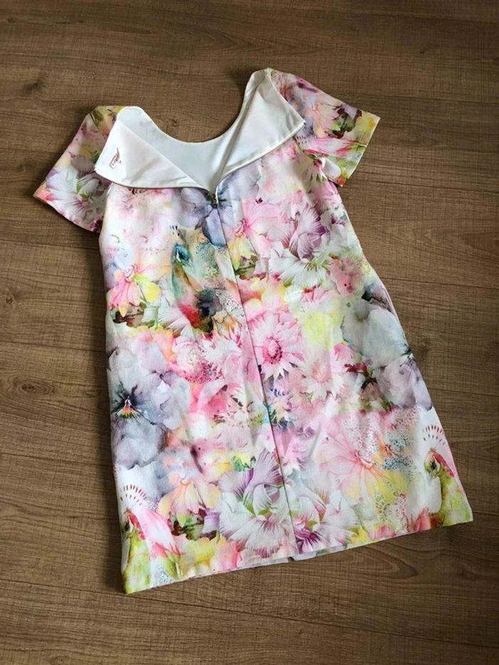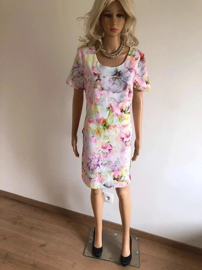 Magnifique robe imprimée fleurie a manches courtes, de marque ESQUALO. Fermeture dans le haut du dos. Taille 40. Jamais portée, état neuf. aisselle à aisselle 50 cms épaule à épaule 40 cms taille 47 cms longueur depuis épaule 92 cms 100% polyester Le prix reste négociable dans la limite du raisonnable. Un petit cadeau dans le colis. (Boîte 21)