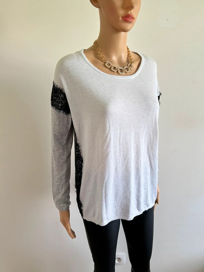 Pull fin blanc et gris, de marque Kaporal. Taille S. Porté souvent, état satisfaisant. aisselle à aisselle 56 cms et plus taille 51 cms et plus longueur depuis épaule 58 cms Le tissu est extensible Étiquette intérieure de composition coupée (Boîte 6)