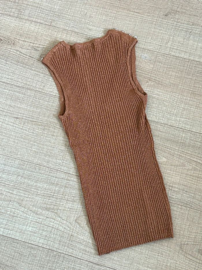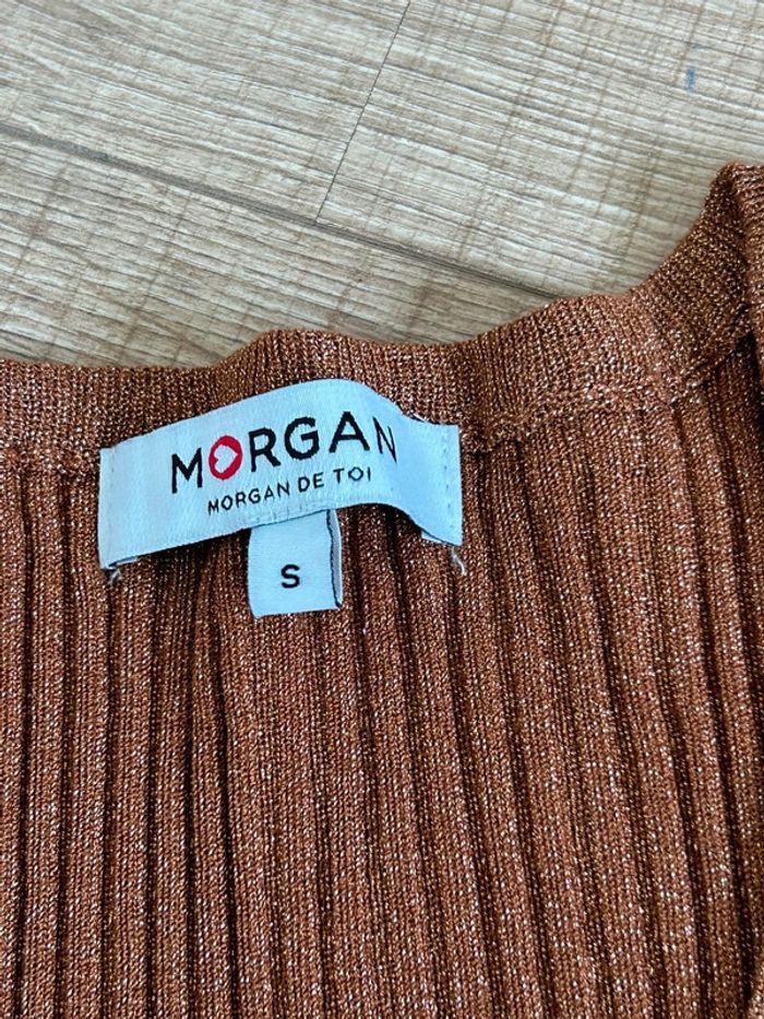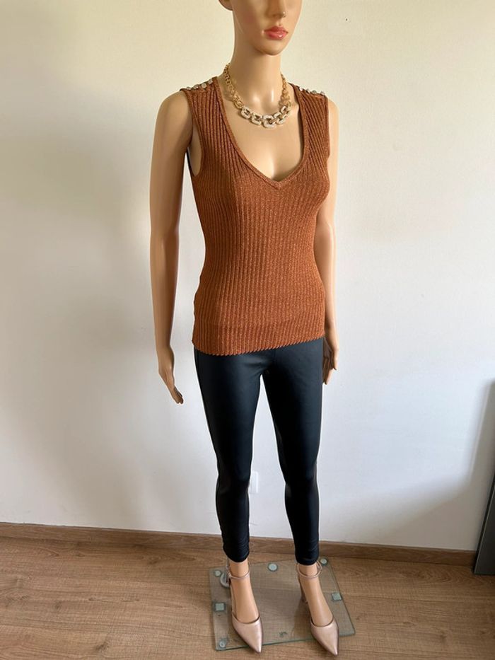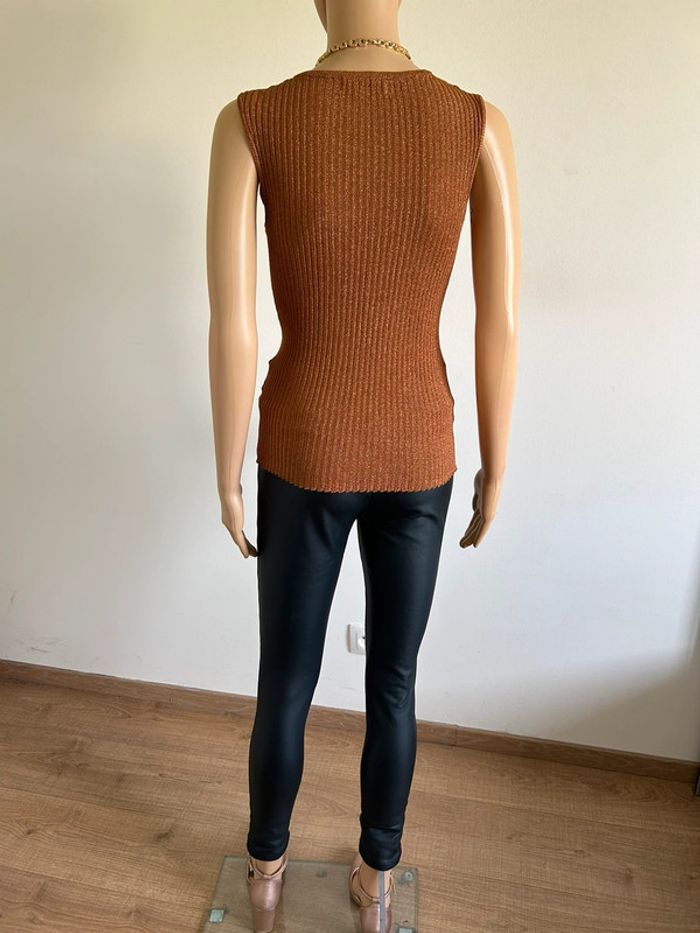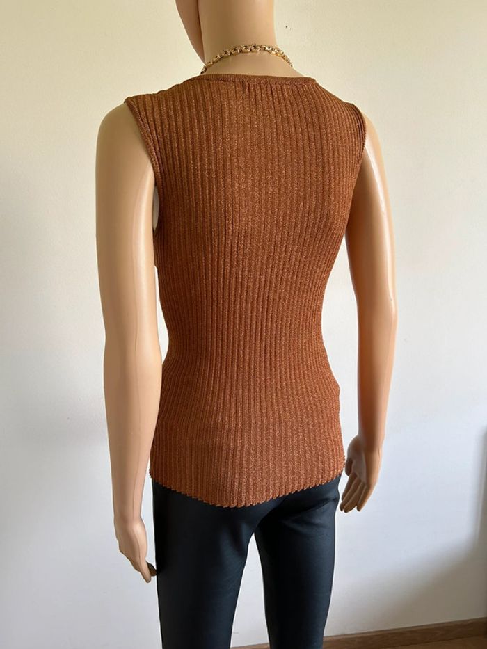 Magnifique débardeur marron pailleté sans manches, de marque Morgan. Taille S. Jamais porté, état neuf. aisselle à aisselle 25 cms à 45 cms taille 21 cms à 40 cms longueur depuis épaule 57 cms Le tissu est extensible Étiquette intérieure de composition coupée Le prix reste négociable dans la limite du raisonnable. Un petit cadeau dans le colis 🌸 (Boîte 8)