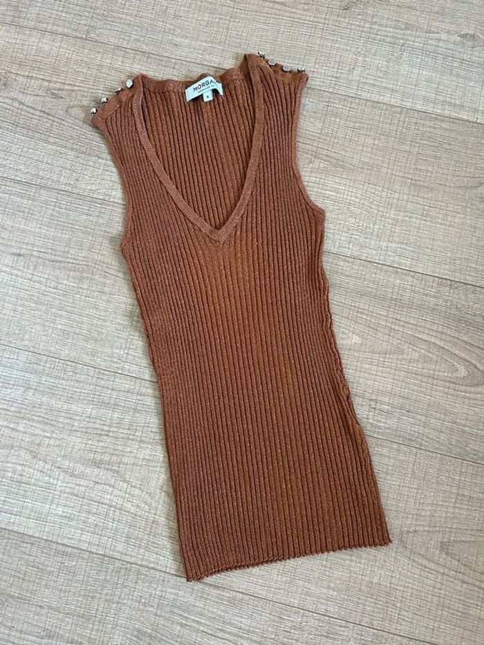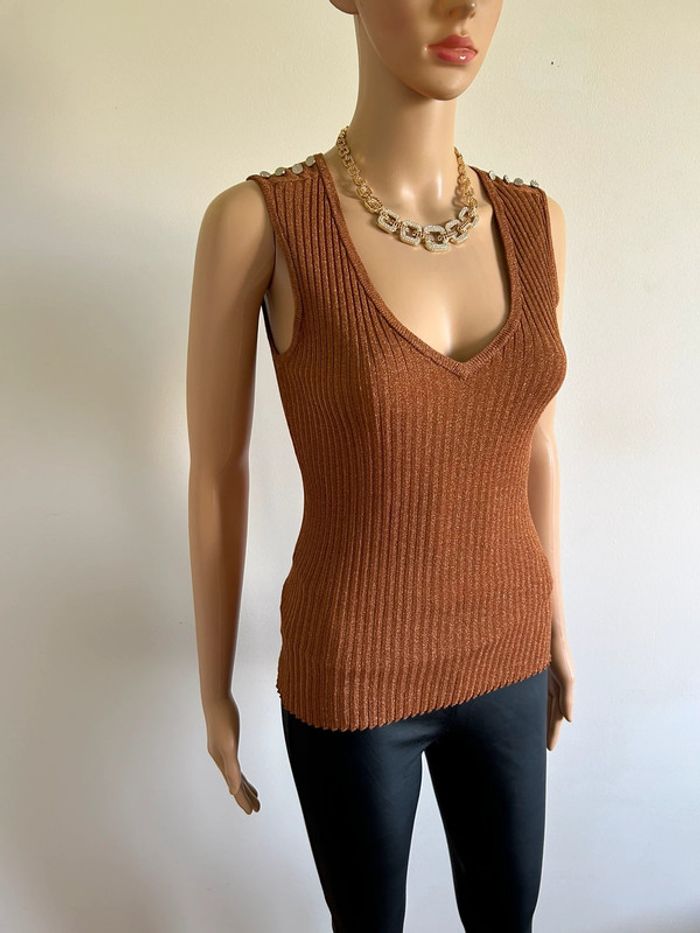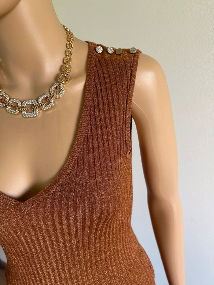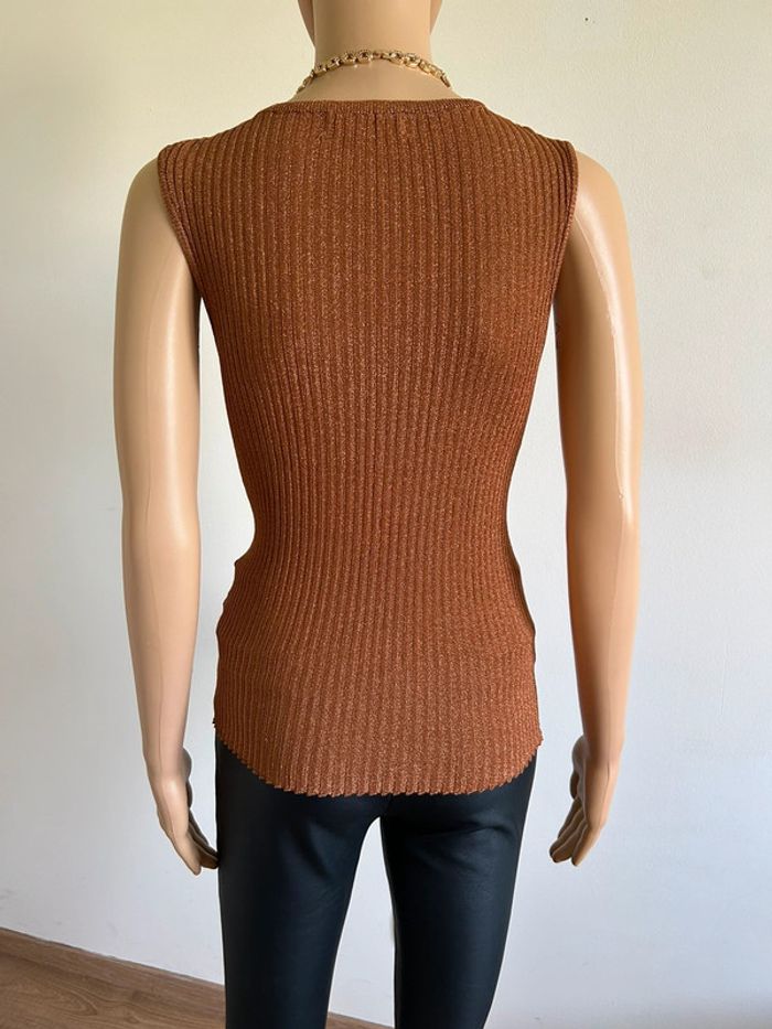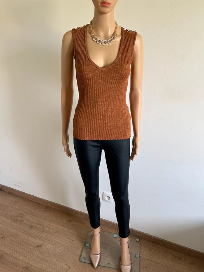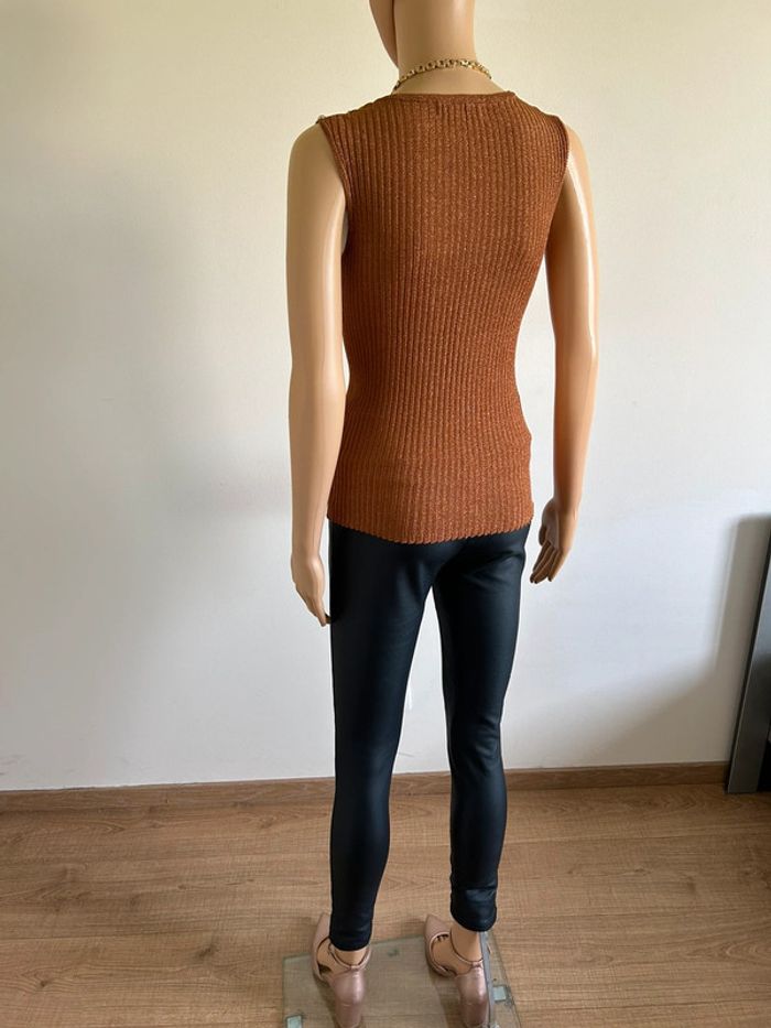 Magnifique débardeur marron pailleté sans manches, de marque Morgan. Taille S. Jamais porté, état neuf. aisselle à aisselle 25 cms à 45 cms taille 21 cms à 40 cms longueur depuis épaule 57 cms Le tissu est extensible Étiquette intérieure de composition coupée Le prix reste négociable dans la limite du raisonnable. Un petit cadeau dans le colis 🌸 (Boîte 8)