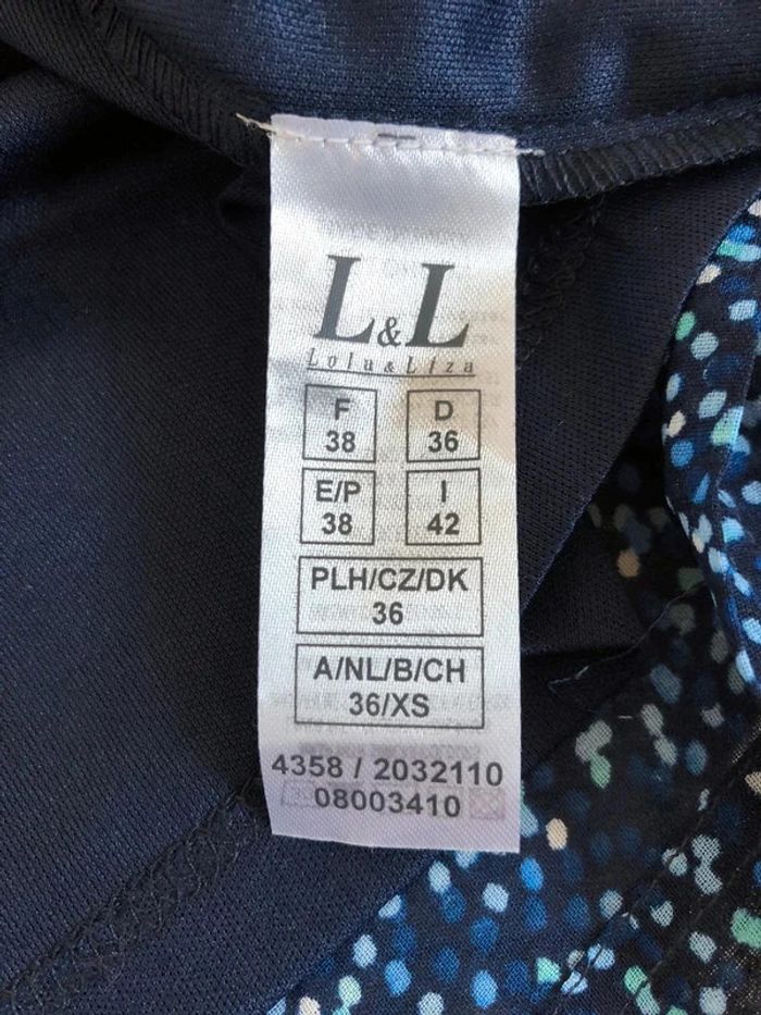 Jolie robe bleue à pois, à manches courtes, de marque LolaLiza. Possibilité de mettre une ceinture, il y a des passants. Taille indiquée XS et taille française 38. Peu portée, en très bon état. aisselle à aisselle 45 cms épaule à épaule 36 cms taille 36 cms à 45 cms longueur depuis épaule 89 cms La taille est extensible 100% polyester Le prix reste négociable dans la limite du raisonnable. Un petit cadeau dans le colis. (Boîte 46)