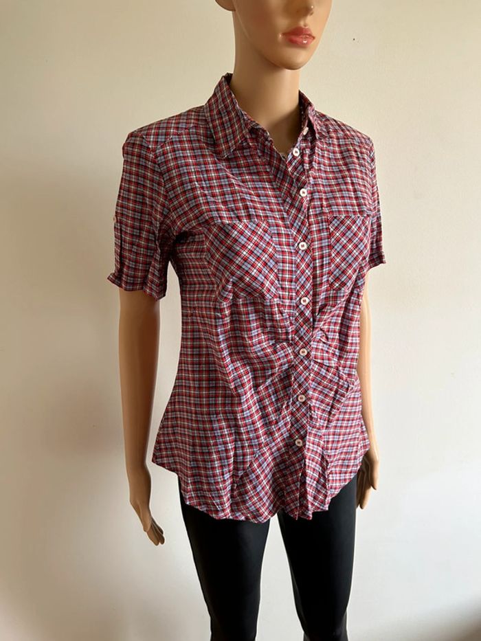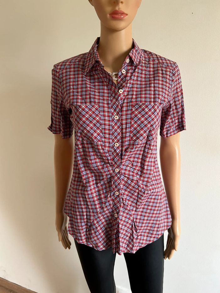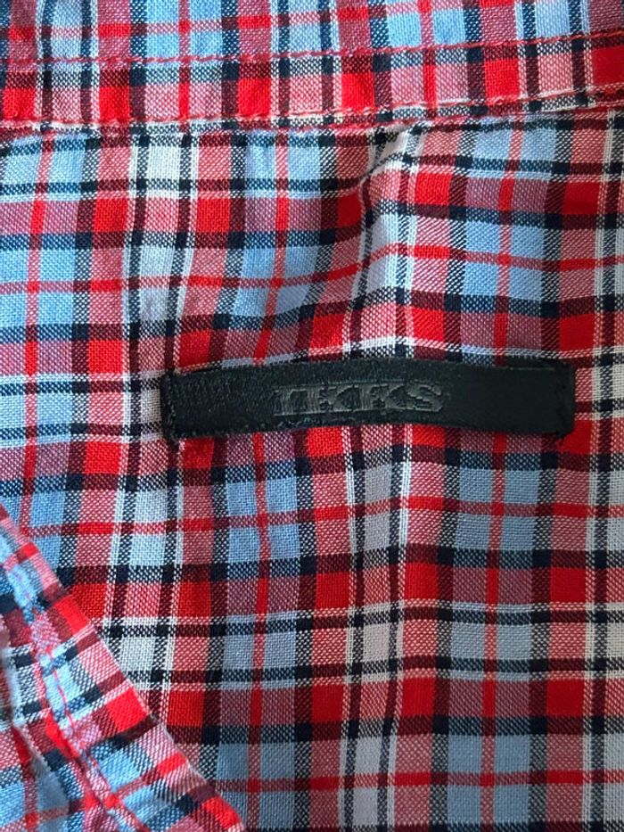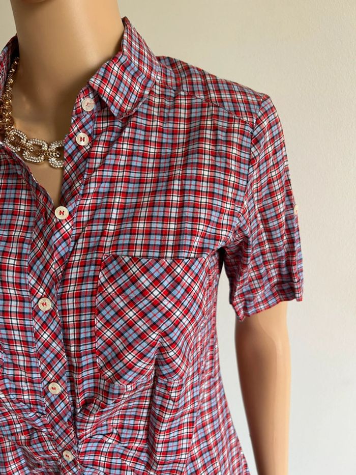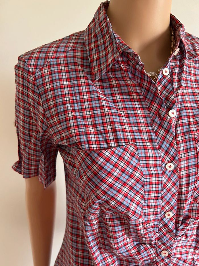 Jolie chemisette à carreaux et manches courtes, de marque IKKS. Correspond à une taille 36 (étiquette de taille coupée, voir mesures en dessous). Peu portée, en excellent état. aisselle à aisselle 46 cms épaule à épaule 39 cms taille 40 cms longueur depuis épaule 60 cms Étiquette intérieure de composition coupée Le prix reste négociable dans la limite du raisonnable. Un petit cadeau dans le colis 🌸 (Boîte 6)